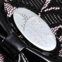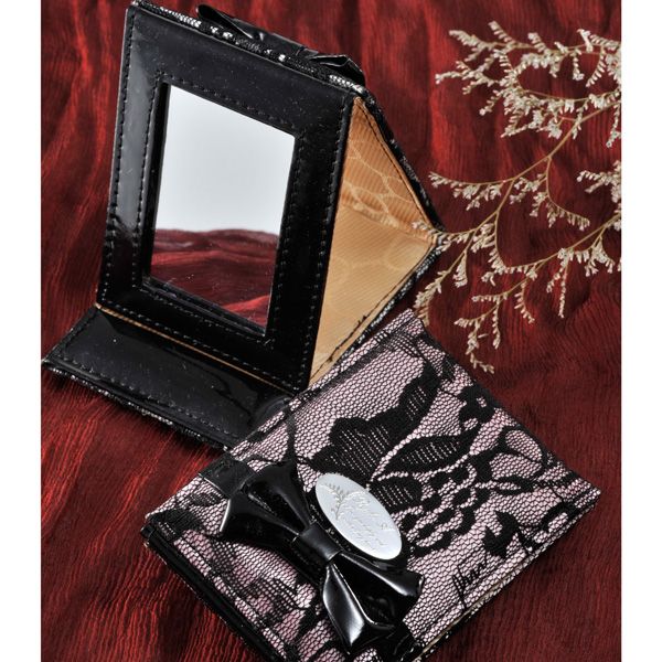 名入れ プレゼント 女の子なら絶対に持ちあるきたいミラー! レースで覆われた上品な女性らしい雰囲気があるシックなミラーです!リボンでキュートな感じです! 表面にオーバルのプレートがつくので そこの部分に好きな内容で彫刻できます!!名前やメッセージをいれてプレゼントにも喜ばれています。