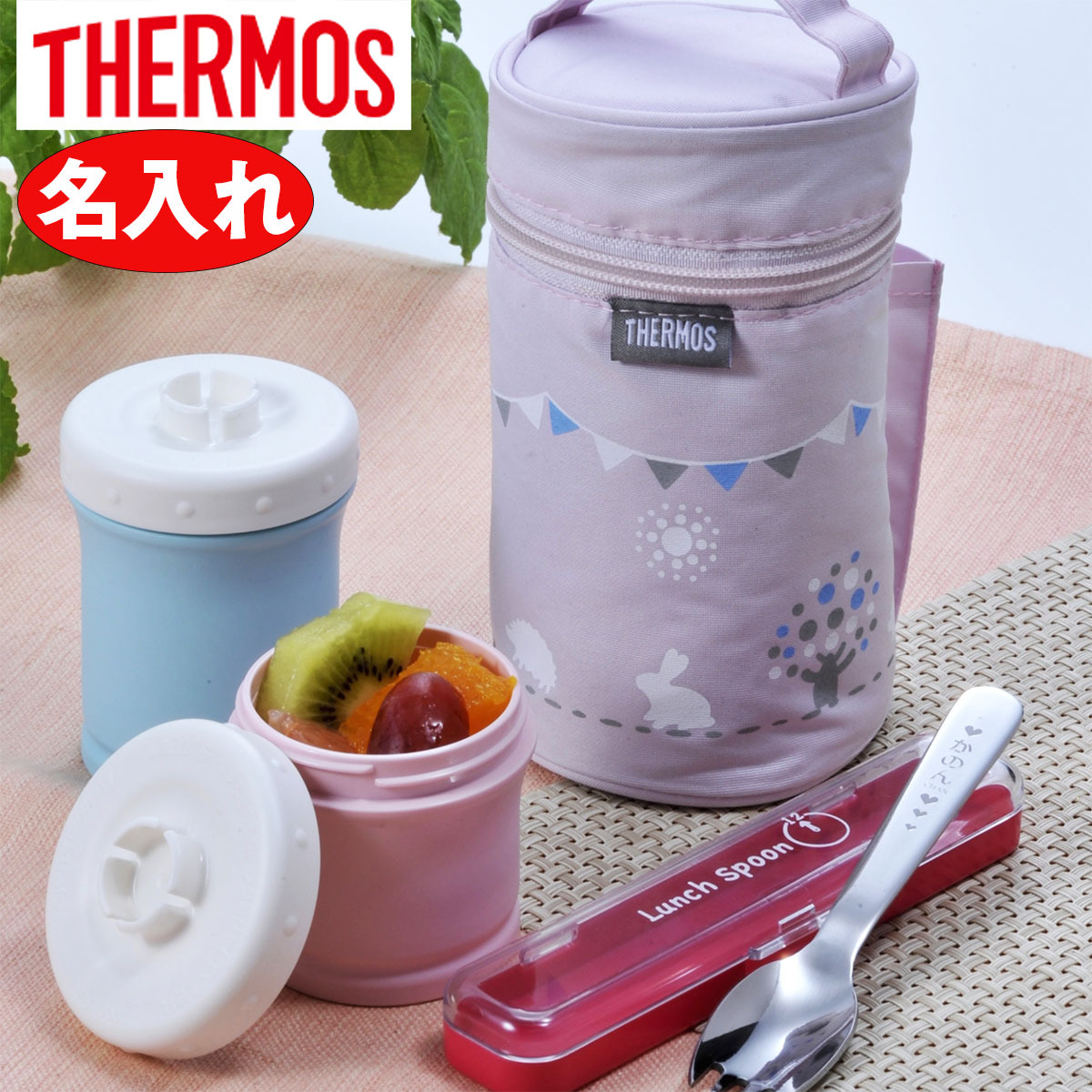出産祝い 1歳誕生日 百日記念 名入れ サーモス 保冷ポーチ付き離乳食ケース 日本製2WAYスプーンフォーク付き