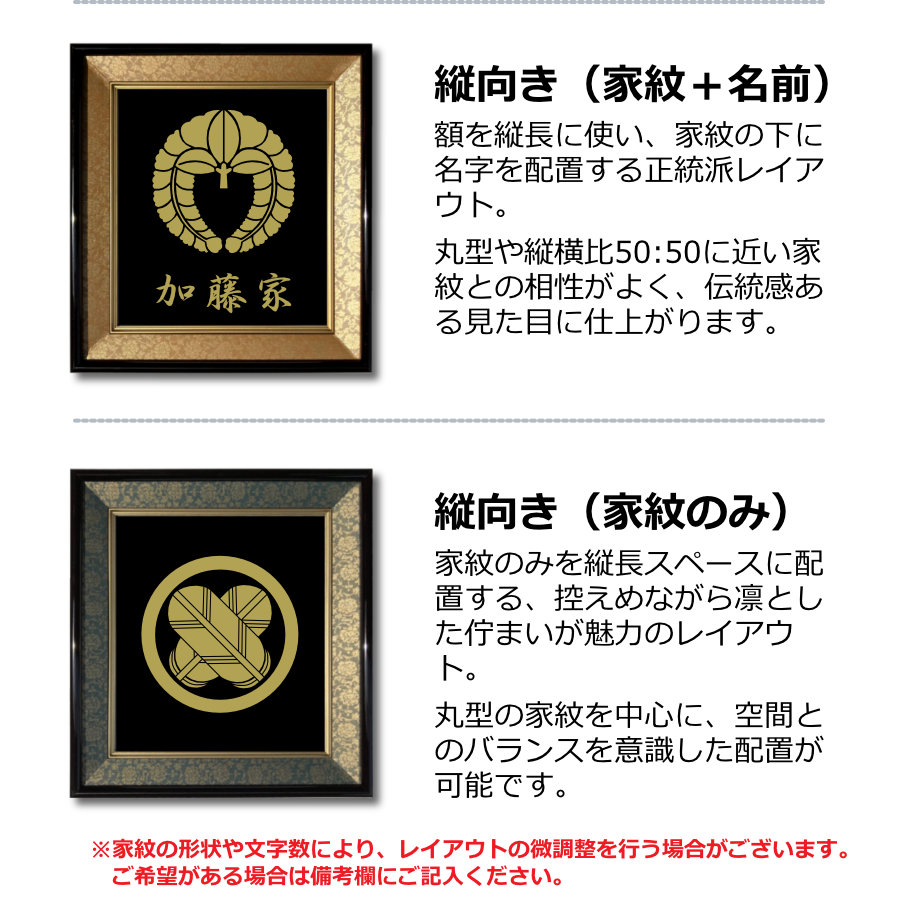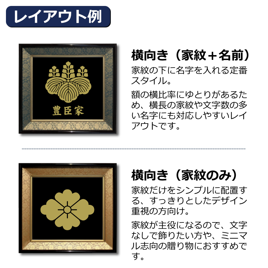 ご友人・同僚の新築祝い・ご両親えのプレゼント・事務所の置物・ご自宅の床の間や和風店などに家紋額をご利用頂けます。