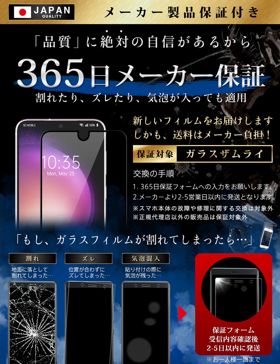 ガラスザムライは製造方法と素材を徹底して追求。 更に、270℃で1時間、410℃で5.5時間。+1時間の冷却をして、約6.5時間かけて ”割れないガラスフィルム” を実現しています。