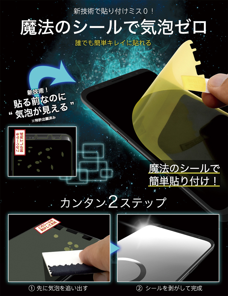 ● 貼る前に気泡がみえる!? “魔法のシール付き” ~ 貼り付けミス0。新技術!フィルムを貼る前に気泡が浮き出る!浮かび上がった空気を出してから簡単貼り付け。( ※特許出願済み )