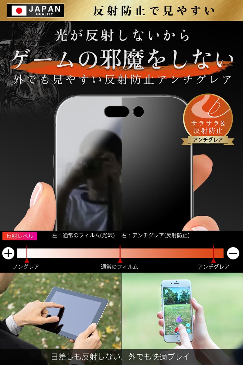 「パズドラで高得点ゲット。」思い通りに 指をすいすい動かせるアンチグレアフィルムを貼って高得点をゲット。【 ギラギラ感を抑える 低反射 】人影、蛍光灯や太陽光の反射など「ギラギラ感」をなくす低反射。反射低減フィルムのアンチグレアはあなたのゲームの時間を邪魔しません。