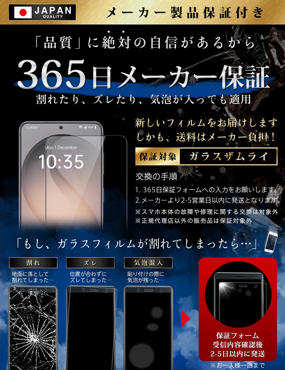 ガラスザムライは製造方法と素材を徹底して追求。 更に、270℃で1時間、410℃で5.5時間。+1時間の冷却をして、約6.5時間かけて ”割れないガラスフィルム” を実現しています。