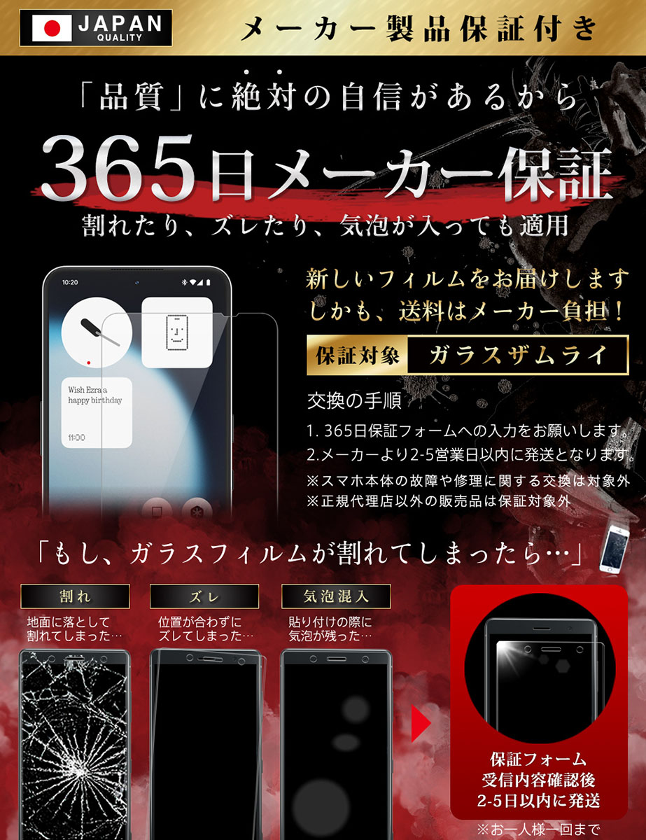 「フィルムって貼るのが難しい… 」 という悩みがありました。「誰でも簡単に、ズラさず貼るには?」 を考え、誰でもキレイに貼れるように「らくらくクリップ」を開発しました。実用新案取得済み【 ● らくらくクリップ が付属! 】ガラスザムライと一緒にお届けします。