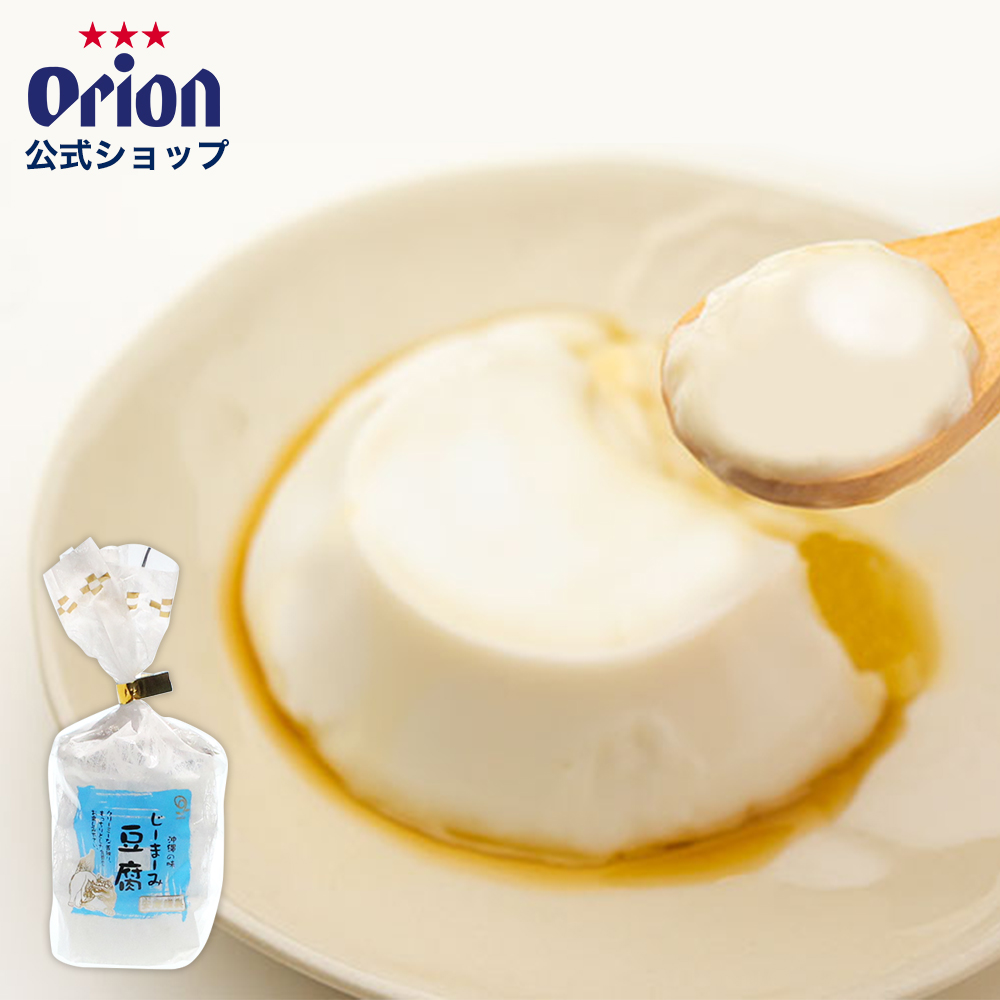「じーまーみ豆腐」 じーまーみとは沖縄方言で落花生(ピーナッツ)のことを指し、じーまーみ豆腐はピーナッツをすり潰してこした豆乳で作られております。モッチリとした弾力ある食感とやさしい甘さが特徴で沖縄の郷土料理のして人気です。冷蔵庫で冷やして別添のタレをかけてお召し上がりください。