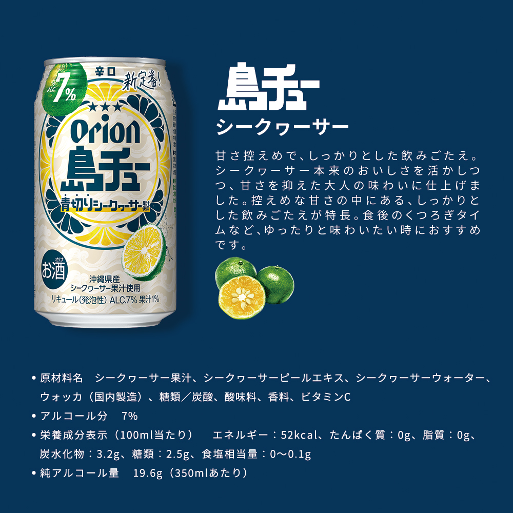 | 商品説明 | 沖縄の青切りシークヮーサーで仕上げた、本格派の7%チューハイ オリオン 島チューは、“家飲みでも、おいしさに妥協しない"本格的な味わいを追求した、オリオンの新チューハイブランドです。 沖縄の素材を厳選し、甘さを抑えたキレのある味わいと、しっかりとした飲みごたえに仕上げました。本格的な味わいで、今日の家飲み時間をより豊かに。こだわり抜いた一杯を、ぜひお楽しみください。 ■青切りシークヮーサーとは? 完熟前、果皮が青いうちに収穫されたシークヮーサーを「青切りシークヮーサー」と呼びます。青切りシークヮーサーは、数ある柑橘の中でも、ひときわ際立つ酸味と清々しい香りを持ち、沖縄では、果実や果汁を飲料や調味料、料理のアクセントとして幅広く活用されています。「島チュー」では、この“青切りシークヮーサー”だけを厳選して使用。甘さを抑えた辛口の設計に、鮮烈なキレと心地よい香りをもたらしています。他の柑橘では表現できない、力強くも爽やかな飲みごたえ――それを支えているのが、青切りシークヮーサーです。 ■島チュー シークヮーサー 甘さ控えめで、しっかりとした飲みごたえ。シークヮーサー本来のおいしさを活かしつつ、甘さを抑えた大人の味わいに仕上げました。控えめな甘さの中にある、しっかりとした飲みごたえが特長。食後のくつろぎタイムなど、ゆったりと味わいたい時におすすめです。 |