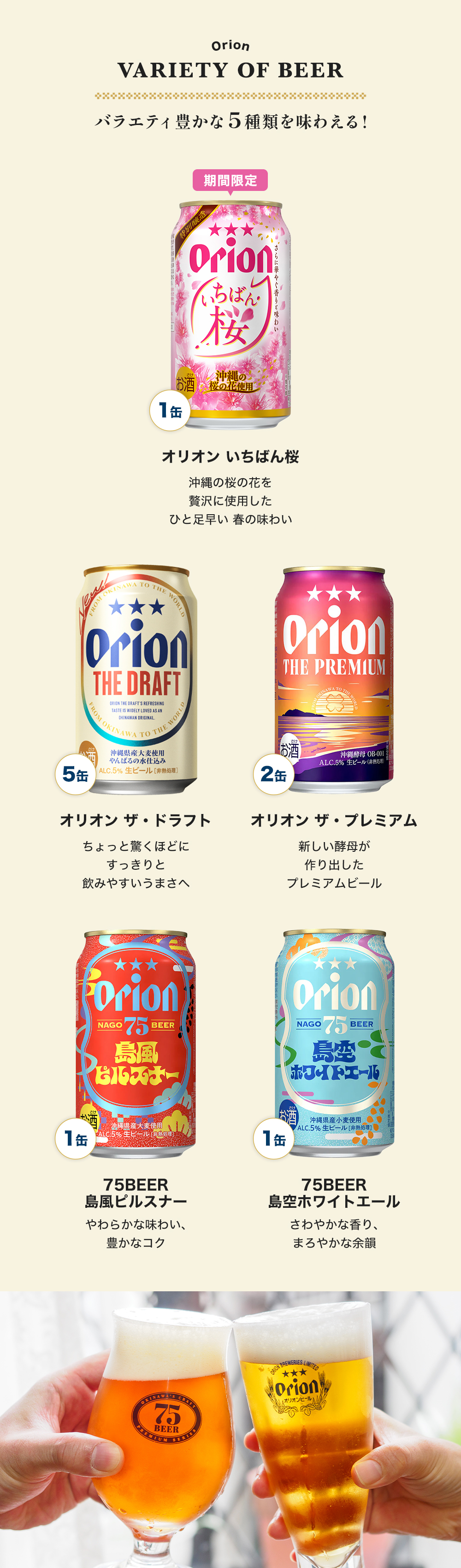 オリオン ザ・ドラフト × 5缶 発売からじつに64年。ちょっと驚くほどスッキリと、飲みやすいうまさへ。ビールにとって余分な雑味の元となる 成分をより多く取り除く、新たなろ過製法を採用しています。沖縄で生まれ、沖縄とともに歩みつづける私たちだからできることを、これからも。
