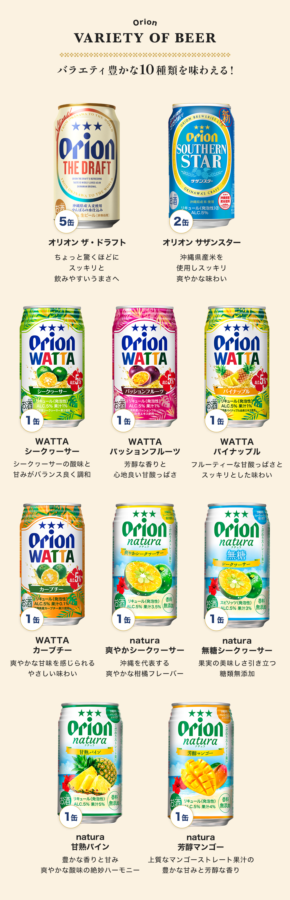 | セット内容 | オリオン ザ・ドラフト 5缶 オリオン サザンスター 2缶 WATTAシークヮーサー 1缶 WATTAパッションフルーツ 1缶 WATTAカーブチー 1缶 WATTAパイナップル 1缶 natura 爽やかシークヮーサー 1缶 natura 無糖シークヮーサー 1缶 natura 甘熟パイン 1缶 natura 芳醇マンゴー 1缶 |