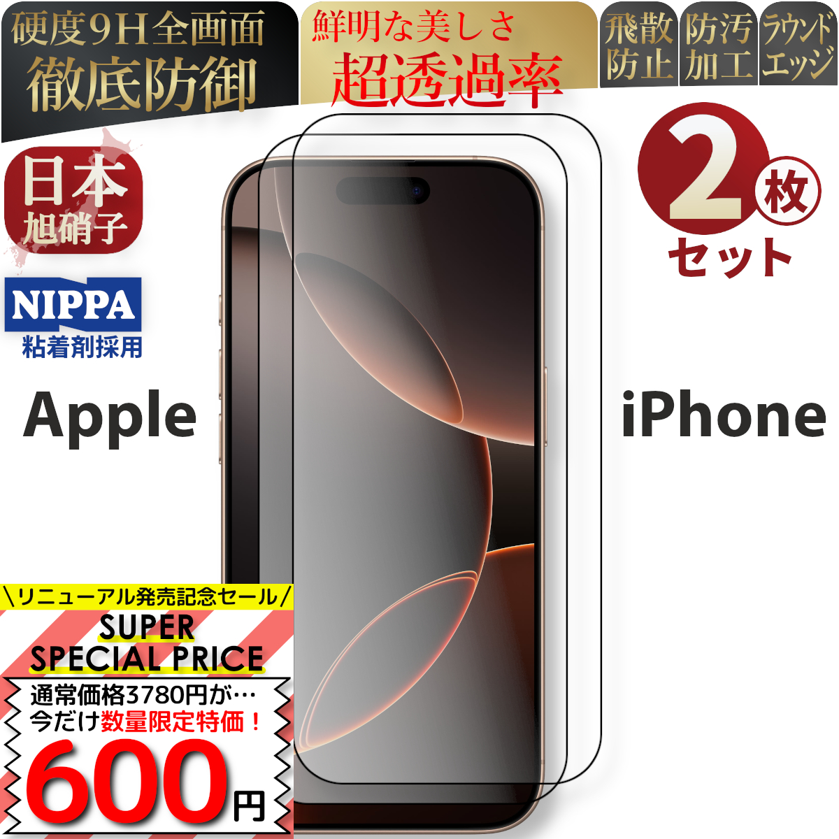 iPhone 全面保護 高品質 ガラスフィルム 2枚セット