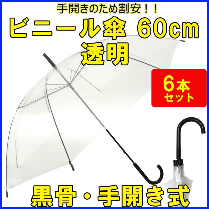 即納 ビニール傘 60cm 手開き式 6本 透明 丈夫な8本骨 60cmビニール傘