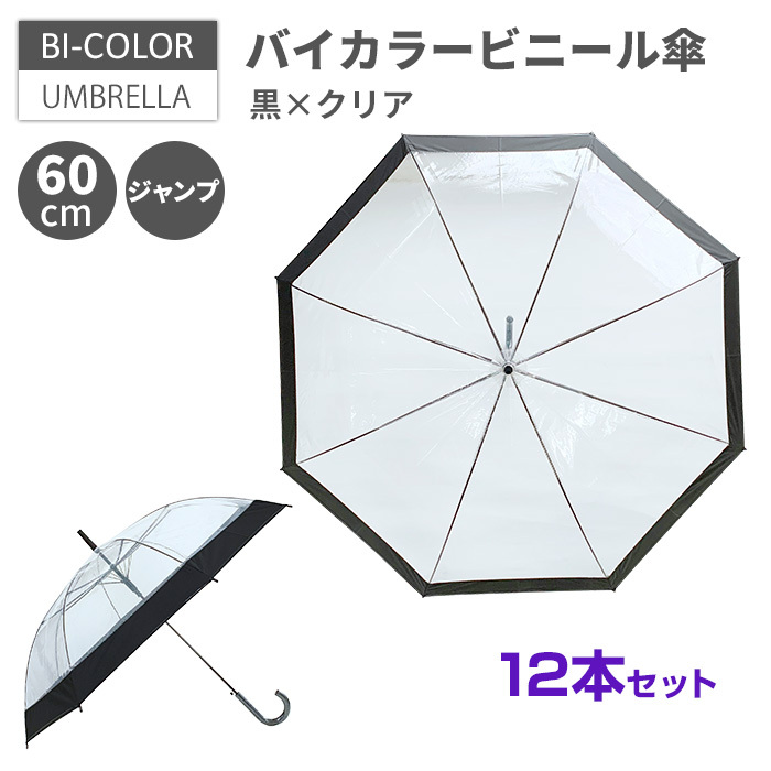 送料無料 ビニール傘 60cm ジャンプ * バイカラービニール傘 60cm 黒×クリア 12本セット *