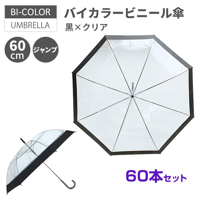 送料無料 ビニール傘 60cm ワンタッチジャンプ * バイカラービニール傘 60cm 黒×クリア 60本セット(1c/s) *