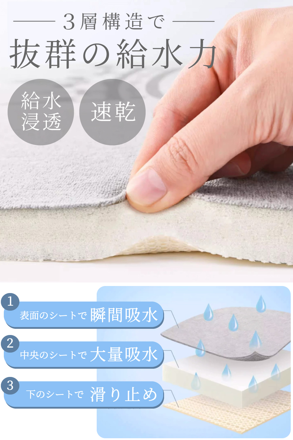 | 構造 | 3層構造になっており、表面のシートは瞬間吸水、中央のシートで大量吸水、最下部のシートは滑り止めになっており、お客様の心地のよさを追及した、おしゃれな極厚マットです。 |