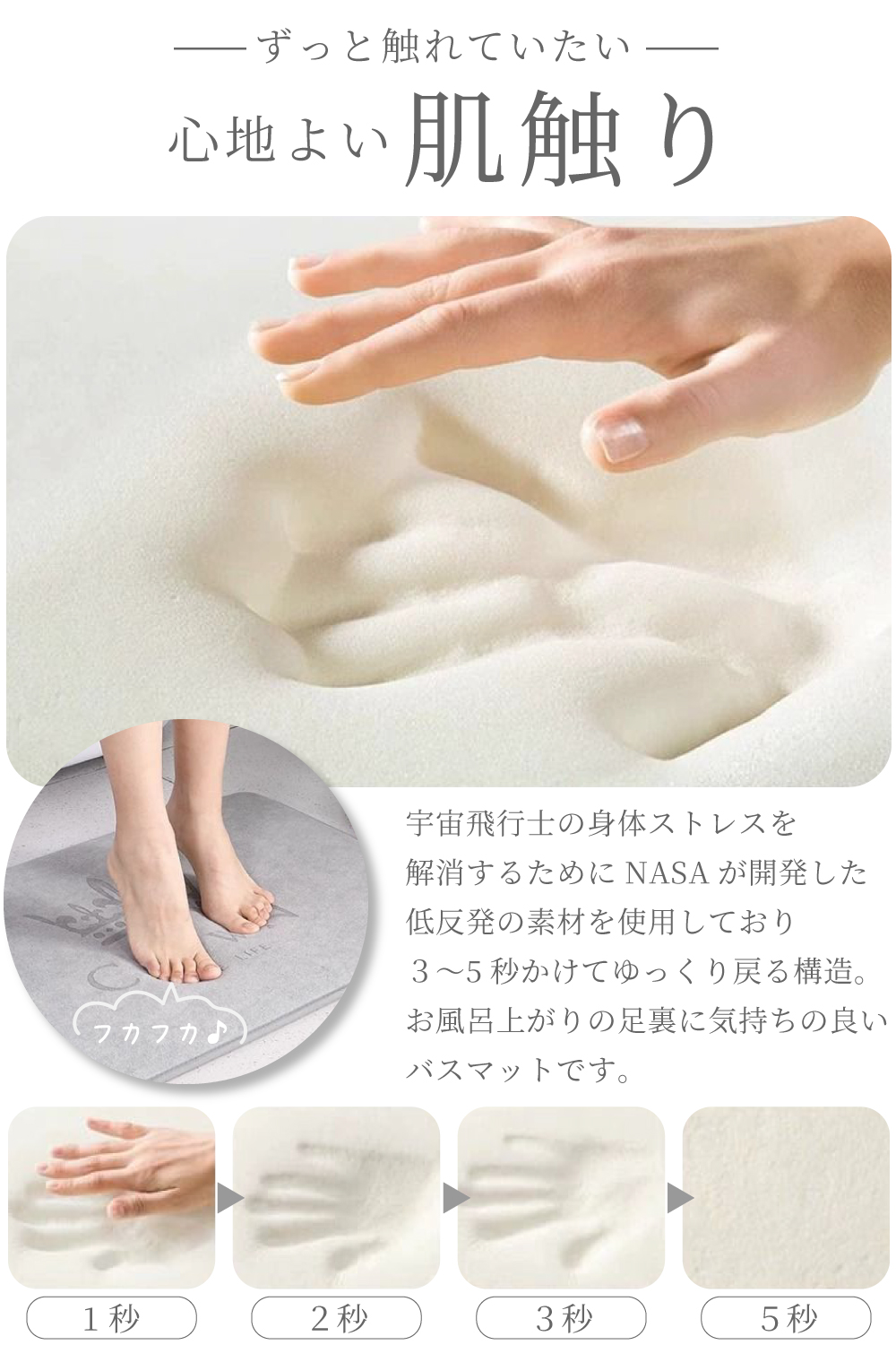 | 特徴 | お風呂の出入りを、足元からさらに心地よくしてくれる、低反発の極厚マット、一度使ったらその心地よさにやめられなくなります! |