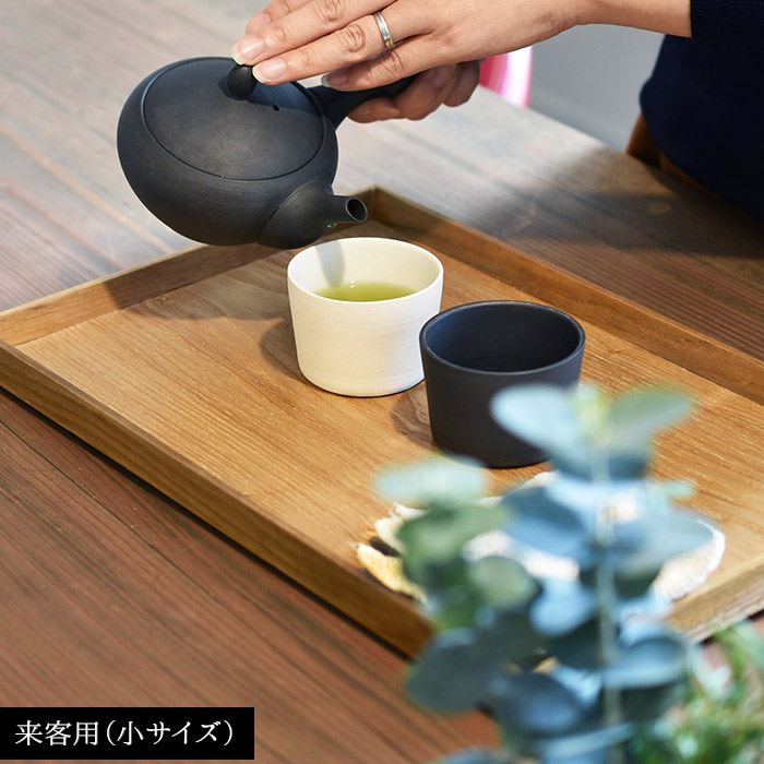 来客用の湯呑みの役割は、会話中の口の乾きをうるおすこと。だから、ごくごく飲むような量は求めません。サイズは適量入る小振りなものを考えました。そして、できる限り高さをなくすこと。背の低い器は倒れにくくこぼしにくいのです。日本人の低姿勢で細やかな心づかいを感じる、おもてなしの来客用湯呑みとなっております。