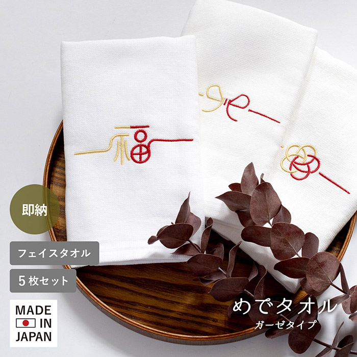 即納 お年賀タオル 粗品タオル 5枚セット めでタオル フェイスタオル 袋入れ加工 ポケット付き 日本製 2026 令和8年 御年賀 粗品 挨拶 プチギフト 個包装 タオル