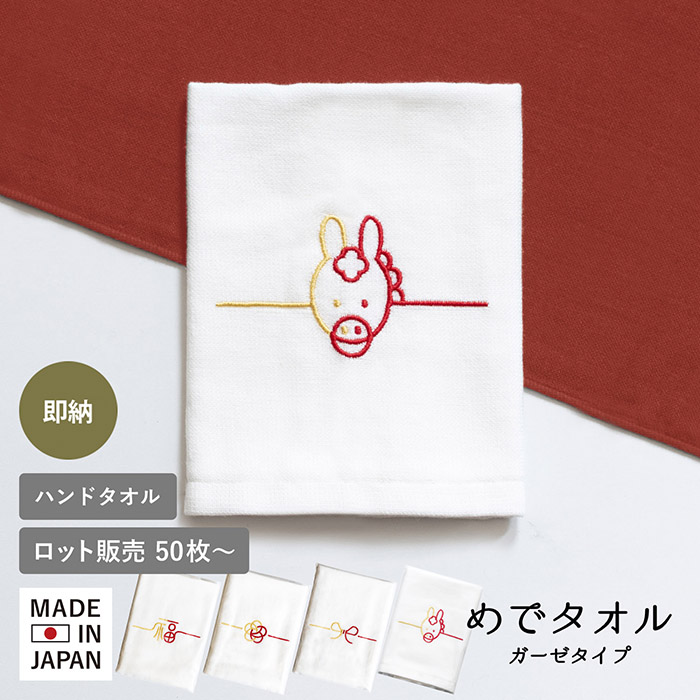 即納 お年賀タオル 干支タオル 【50枚〜99枚】 めでタオル ハンドタオル 袋入り ポケット付き 日本製 午 2026 令和8年 御年賀 干支 粗品タオル 挨拶 プチギフト