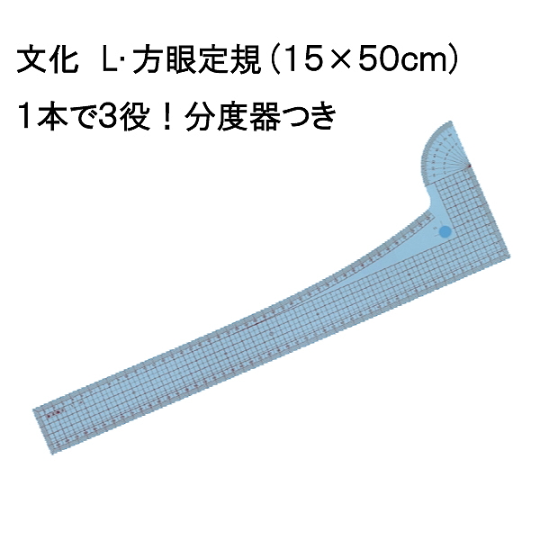 L尺、方眼定規、分度器、ボタンホール作図用穴、1本に4種類の機能を持たせた多機能定規。