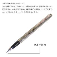 刃先が回転するカッター(0.5mm刃)です。刃が曲線に合わせて回るので、手首や紙を動かす必要がありません。円形切りや、曲線切りがプロに負けなほどに容易にカットできます。キャップのついたボールペンと同じ大きさで、専用ケースも付属しているので持ち運びに便利で安全です。