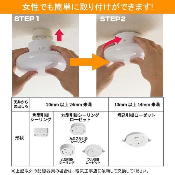 コードカバーをずらし、引掛シーリングにシーリングを差込、右にカチッと音がするまでまわせば取り付け完了。角度調節すれば完了です。女性でも簡単に取り付けができます。