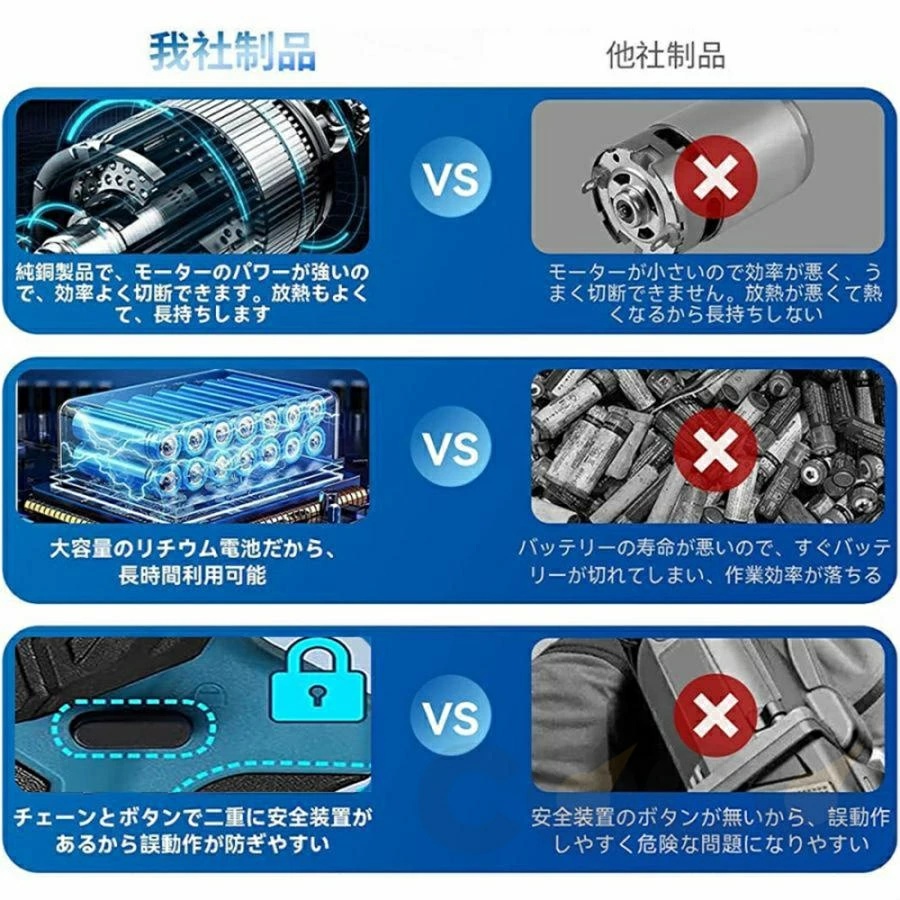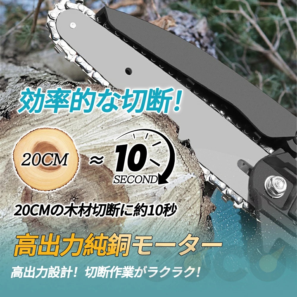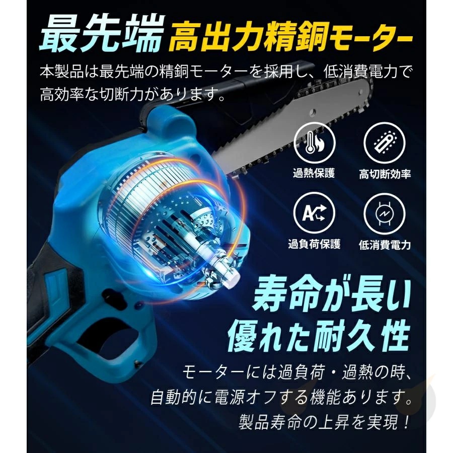 電動チェーンソーはアップグレードされて、ブラシレスモーターを採用します。純銅モーターのチェンソーより、寿命が330%増加し、出力電力が80%増加し、エネルギー消費が60%削減されるし、作業効率が230%向上させます。丈夫な素材と強力なブラシレスモーターを採用して、このブラシレスチェーンソーはスムーズ、低騒音、高効率の切断体験を与えられます。