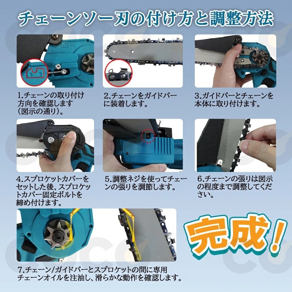 ご使用前に必ず専用のチェーンオイルをチェーンに注油して潤滑させてください!チェーンにオイルを注入しない場合、使用中にチェーンとガイドバー/スプロケット間の摩擦が大幅に増加し、モーターに過度の負担がかかります。この状態が続くと、断熱材から煙が出始め、匂いを放つようになります。