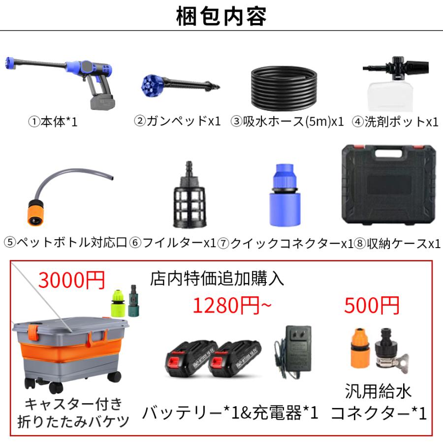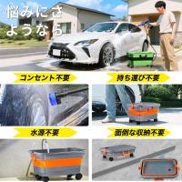 【水道が必要ない&節水】本高圧洗浄機コードレスは洗車スタッフ監修で使いやすいです。5mの高圧ホースが柔らかく取り回しやすく、収納ケースがあり、収納時に場所を取りません。 洗浄場所への持ち運びも簡単です。小面積の洗浄には、付属のコーラーボトル用コネクターを使ってコーラーボトルから給水することができ、従来の水源の限界を打破し、水道水が使えない場所でもフレキシブルに使用できます。自給式は、バケツや川、池など、様々な場合で利用可能。軽量コンパクトで、収納場所に困らない。ホースで水洗いした場合は1分あたり水使用量約12L。高圧洗浄機で洗浄した場合はただ4L!!節約しながらしつかり洗浄、水使用量を66.9%削減します。大きな容量の水場を使えば、タンク式より長時間使用可能です。使用水温度範囲は0〜50℃で、お風呂の残り湯を使えば水道代を節約できます。