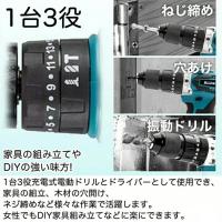 1台3役充電式電動ドリルとドライバーとして使用でき、家具の組立、木材の穴開け、ネジ締めなど様々な作業で活躍します。コードレス設計なので、電源がない場所でも手軽く使えます、女性でもDIY家具組み立てなどに楽にできます。