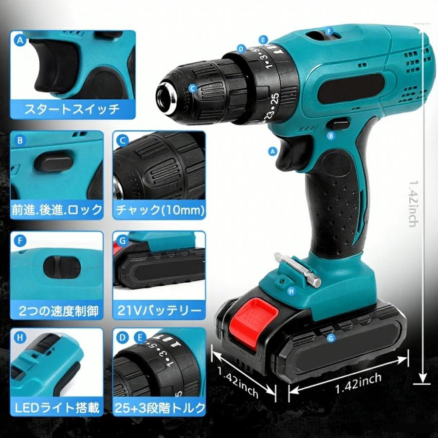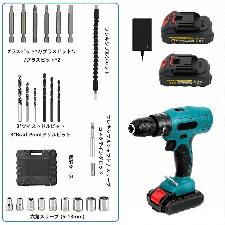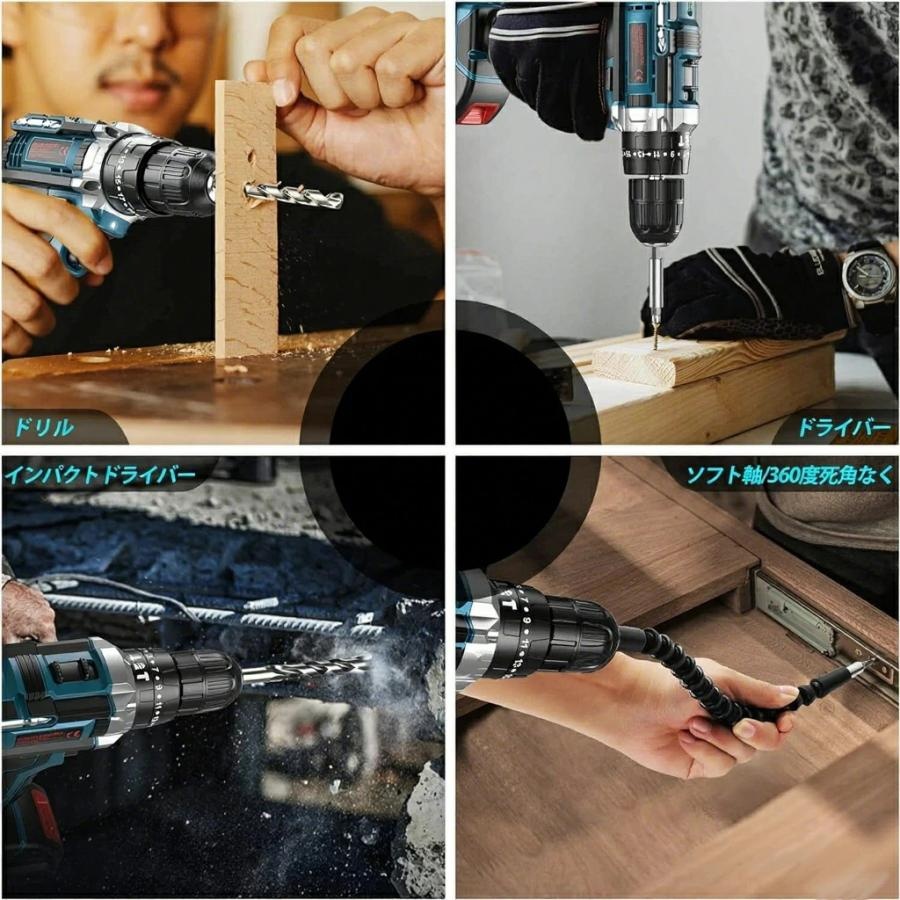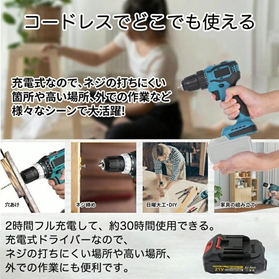 【 21V高性能電動ドライバーセット】 1台3役 充電式電動ドリルとドライバーとして使用でき、家具の組立、木材の穴開け、ネジ締めなど様々な作業で活躍します。コードレス設計なので、電源がない場所でも手軽く使えます。1.5Ah大容量電池(バッテリーに対応) 選択可能、長時間連続作業可能です。わずか1.2kg(バッテリー付き)の重量で、軽量だから片手で持っても疲れにくい、女性でもDIY家具組み立てなどに楽にできます。