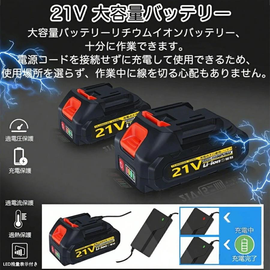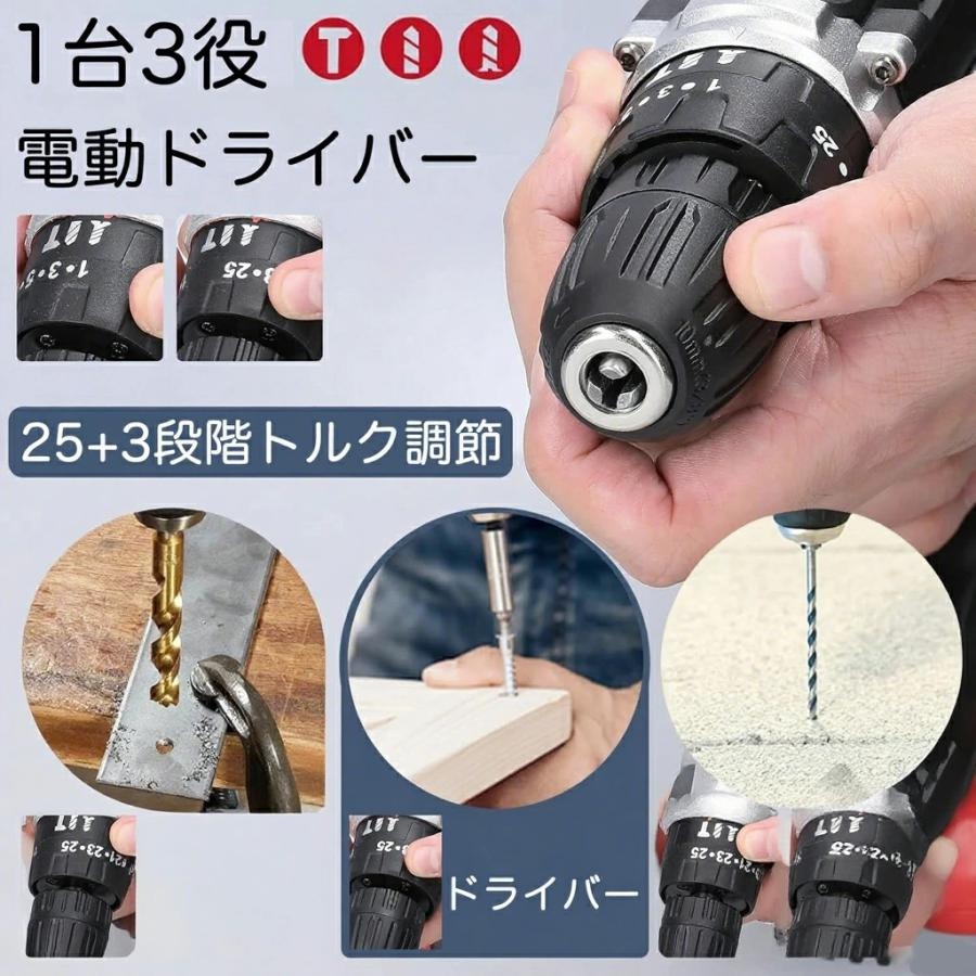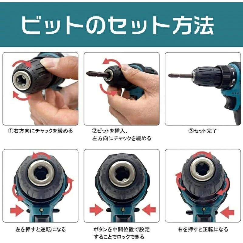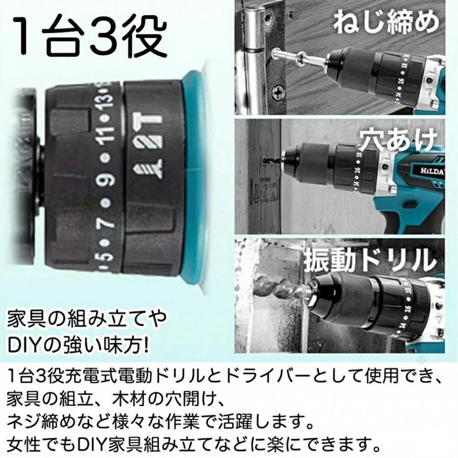【 21V高性能電動ドライバーセット】 1台3役 充電式電動ドリルとドライバーとして使用でき、家具の組立、木材の穴開け、ネジ締めなど様々な作業で活躍します。コードレス設計なので、電源がない場所でも手軽く使えます。1.5Ah大容量電池(バッテリーに対応) 選択可能、長時間連続作業可能です。わずか1.2kg(バッテリー付き)の重量で、軽量だから片手で持っても疲れにくい、女性でもDIY家具組み立てなどに楽にできます。