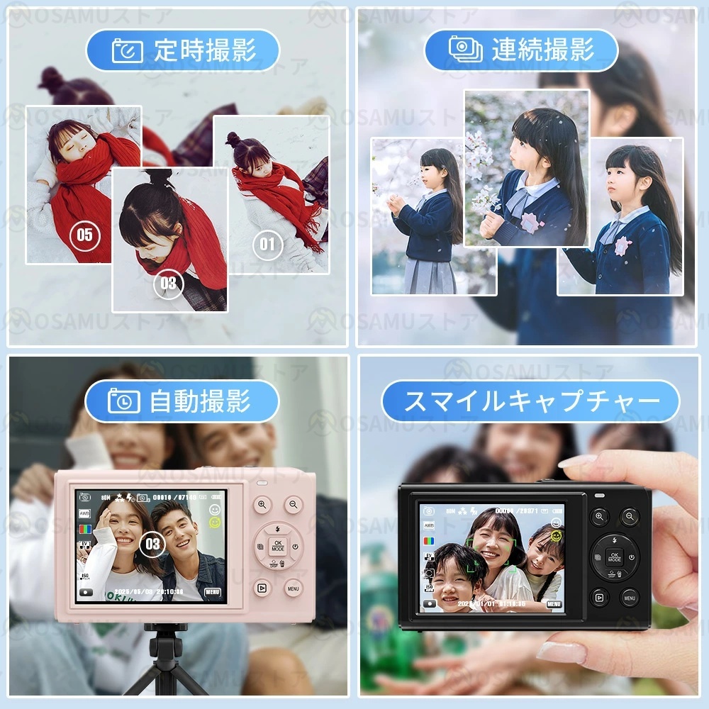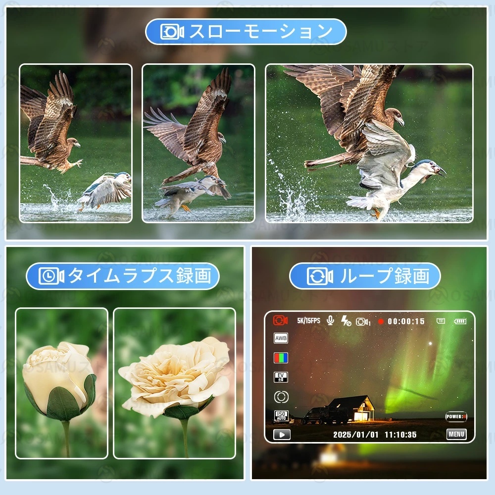 定時撮影/連続撮影/自動撮影/タイムラプス/スローモーション/ループ録画/一時停止機能搭載。