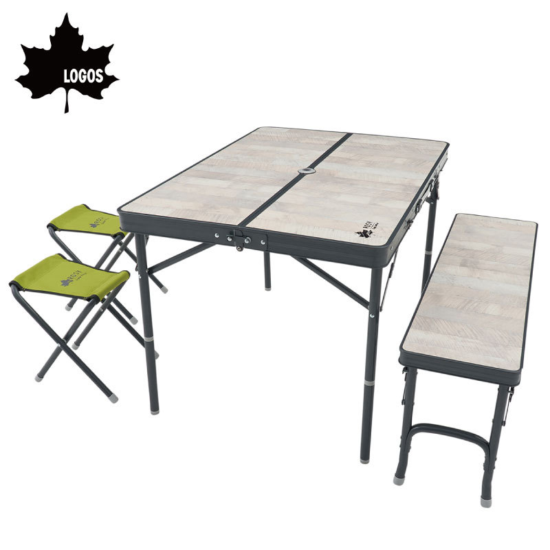 ●高さ調節も可能!コンパクト収納できる4人用テーブルセットテーブルとベンチ、スツール2脚入りの4人用テーブルセット。