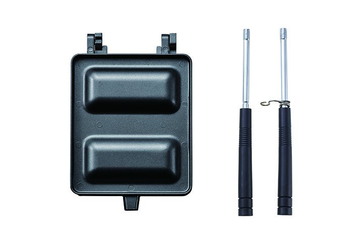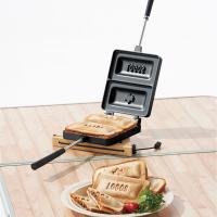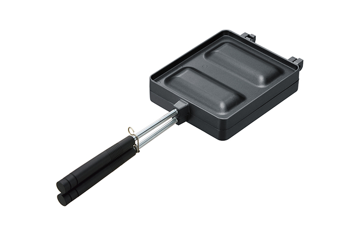 アウトドアでも大活躍! お手軽でおしゃれなホットサンドパン。 ブラック系の配色を採用したホットサンドパンは、食パンサイズなので実用的。パンに好きな具材を挟んで火にかけるだけでホットサンドが完成します。ミミあり、ミミなしどちらのパンでも調理可能。ハンドルは着脱できるので持ち運びがしやすく、収納もコンパクト。