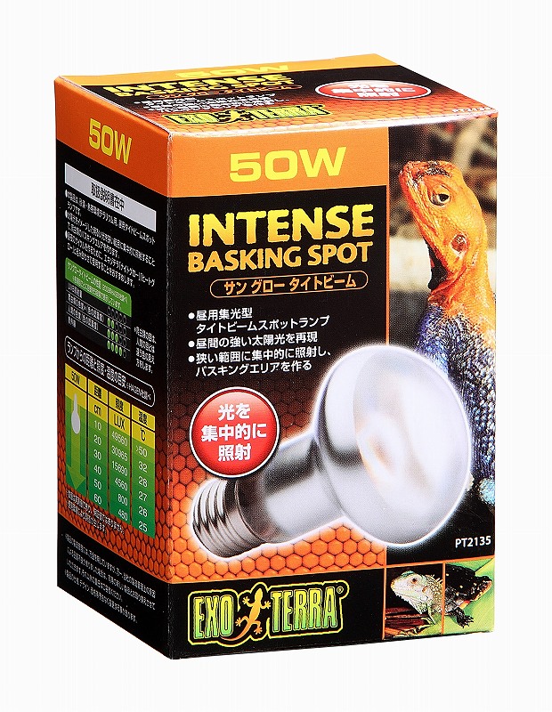 強力な光を狙った場所に集中照射!太陽光をイメージした明るい光を狭い範囲に集中的に照射することで、爬虫類のバスキングエリアを作ります。■砂漠・熱帯環境テラリウム用、昼用タイトビームスポット型ランプです。■昼間の強い光を再現。■狭い範囲に集中的に照射し、バスキングエリアを作る。 ■昼夜のサイクルを作るために、エキゾテラ「ナイトグロー」「ヒートグロー」と組みあわせて使用することをおすすめします。
