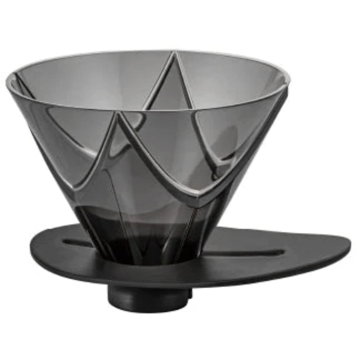 注ぐお湯は一回だけで抽出できるドリッパーです。ドリッパー内側に凸のリブがなく、ドリッパーにペーパーが張りつき星型の『溝』を伝ってゆっくりとコーヒーが抽出されます。ホルダーは取り外せるので、スタンドにのせてドリッパー本体だけで使用することも可能です。