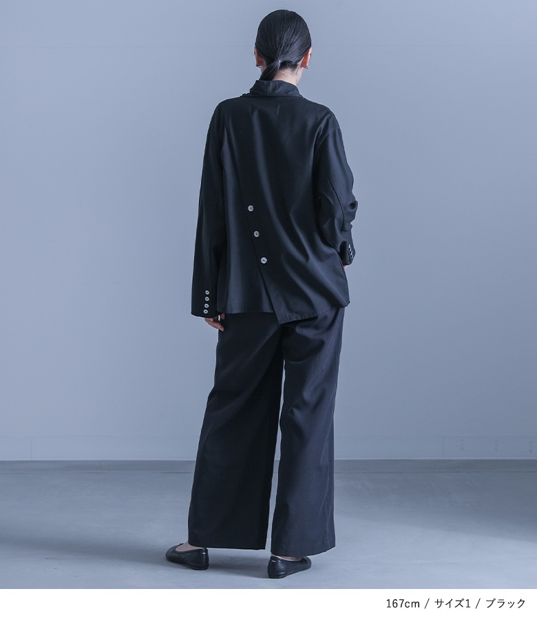 ■デザイン 襟がドレープデザインになった上品な印象のジャケット。バックデザインには金属調のボタンを斜めにあしらい、コーディネートのアクセントになります。袖口にも金属調のボタンをあしらい、個性的な印象は残しつつも統一感のあるスタイリングに。バックデザインのボタンは自由に開閉できる仕様で、その日の気分に合わせてスリットの開き具合を調整できます。両サイドには便利なポケット付きで、手持ちの物をさっと入れることができるのもポイントです。 ■コーディネート デザイン性がありつつもシンプルなので、様々なアイテムに合わせていただけます。デザイン性のあるボトムスや綺麗めな印象のパンツと合わせることでモードな印象、スカートやワンピースと合わせることで上品で女性らしい印象に。また、前身頃のベルトを締めることですっきりとした綺麗めな着こなし、開けることで程良い抜け感を感じるスタイルが完成します。 ■素材 さらりとした肌触りで、柔らかく着心地の良いポリエステル素材混の生地。ジャケットでもさらっと羽織ることができる程よく薄手な生地感で、季節の変わり目の着用にオススメです。 |