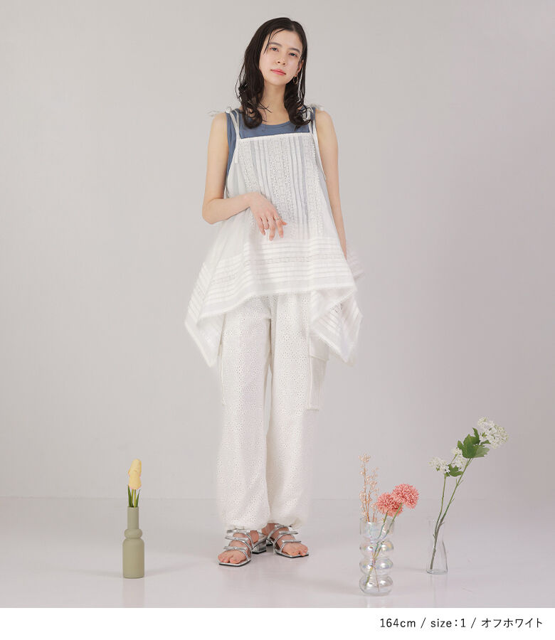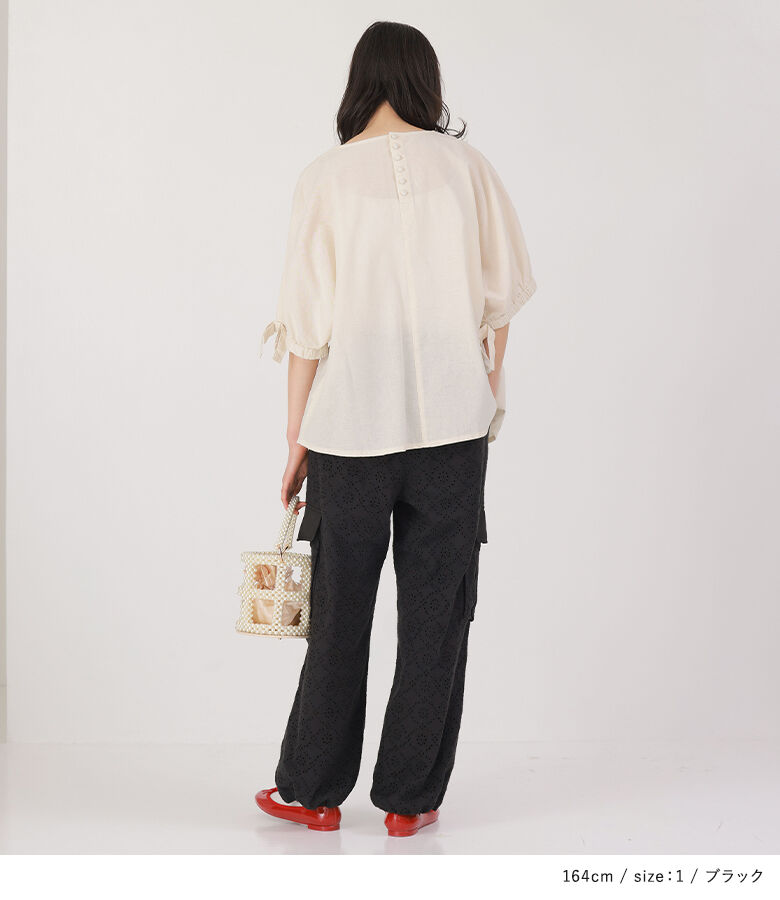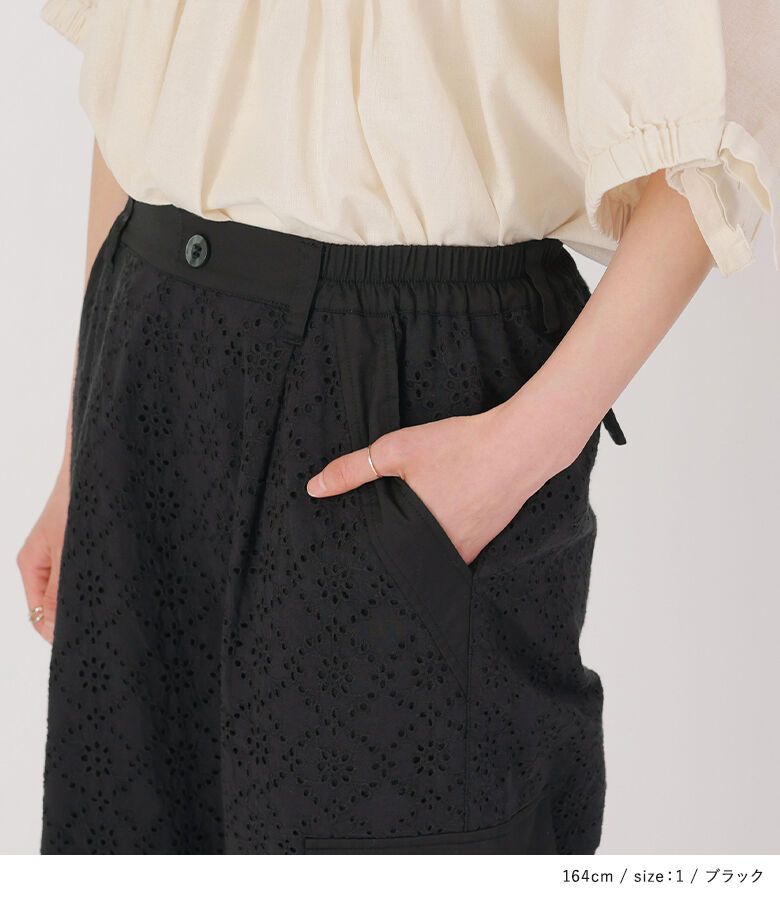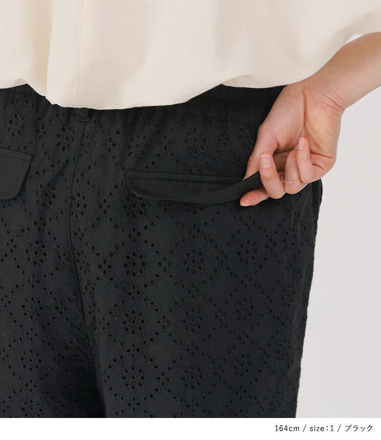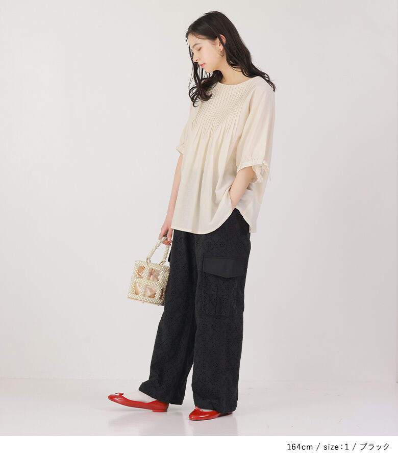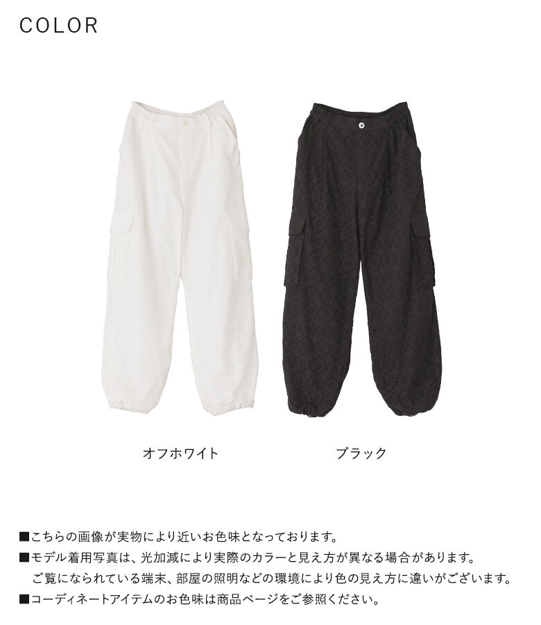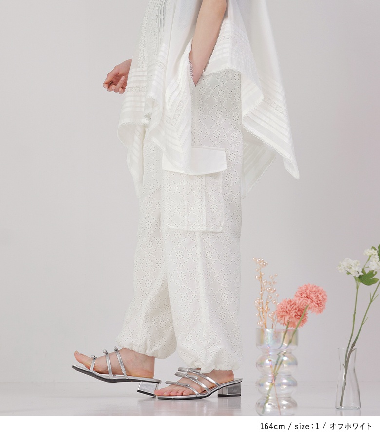 ■デザイン コットンレースを使用したカーゴパンツ。幼くならないようにカジュアルなカーゴパンツに落とし込んだ一着で、甘すぎない花柄で大人っぽくご着用いただけます。サイドポケットはやや立体的にデザインし、単調にならないようにこだわりました。裾は絞らなければストレートシルエットでも着用できます。 ■素材 コットン100%のレース生地を使用。適度に密度のある裏地と2枚仕立てになっています。 ※オフホワイトは透け感がございますのでインナーのご着用をおすすめいたします。 ■ディテール ・両サイドポケット ・後ろはフェイクポケット ・裾は紐が垂れないよう内側タブ入り ・ウエストゴム入り ■コーディネート 甘さとカジュアルさの程良いバランスで、お手持ちのトップスを合わせてデイリーに着回していただけます。 |