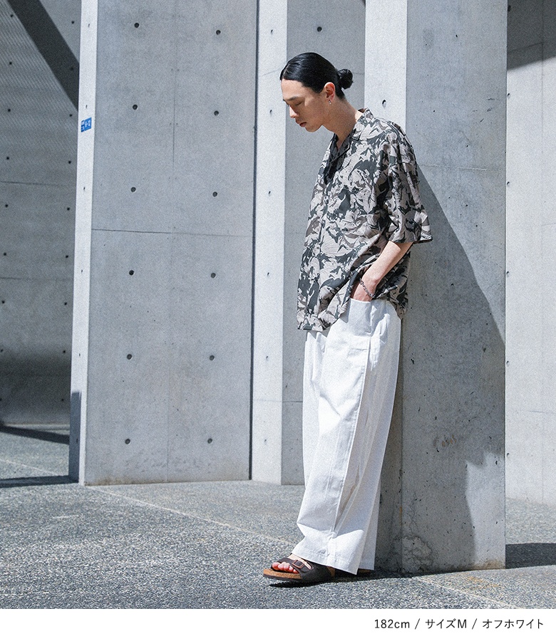 ■デザイン 脇のタックデザインがポイントになるカーブシルエットパンツ。ただ太いだけでなく、裾に向かって細くなるメリハリのあるシルエットが特徴です。立体的なシルエットでシンプルながらも着回しやすく、様々なスタイルにマッチします。 ■コーディネート カットソーやシャツを合わせて、足元はスニーカーやサンダルでカジュアルに。インパクトのある柄シャツ合わせもおすすめです。 ■素材 さらっとした肌触りのコットン100%素材。厚すぎず薄すぎないほどよい厚みで、暑い時期でも快適に着用できます。 |