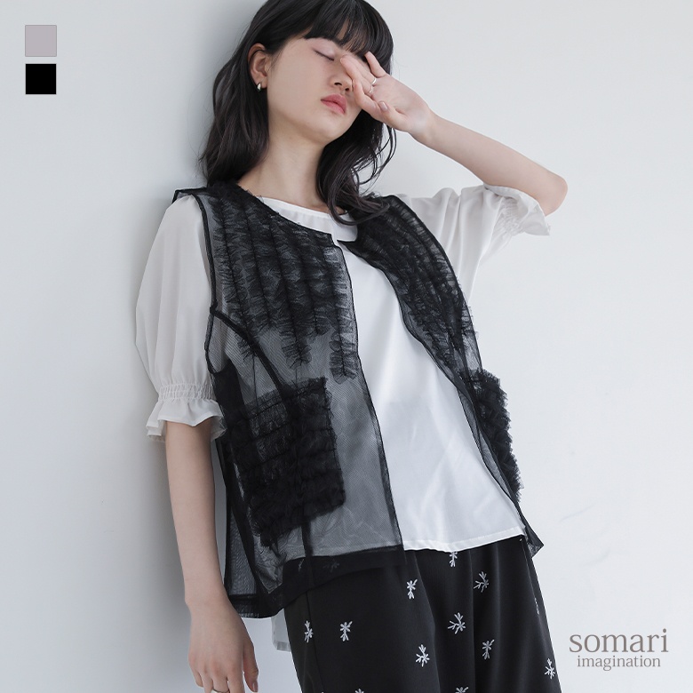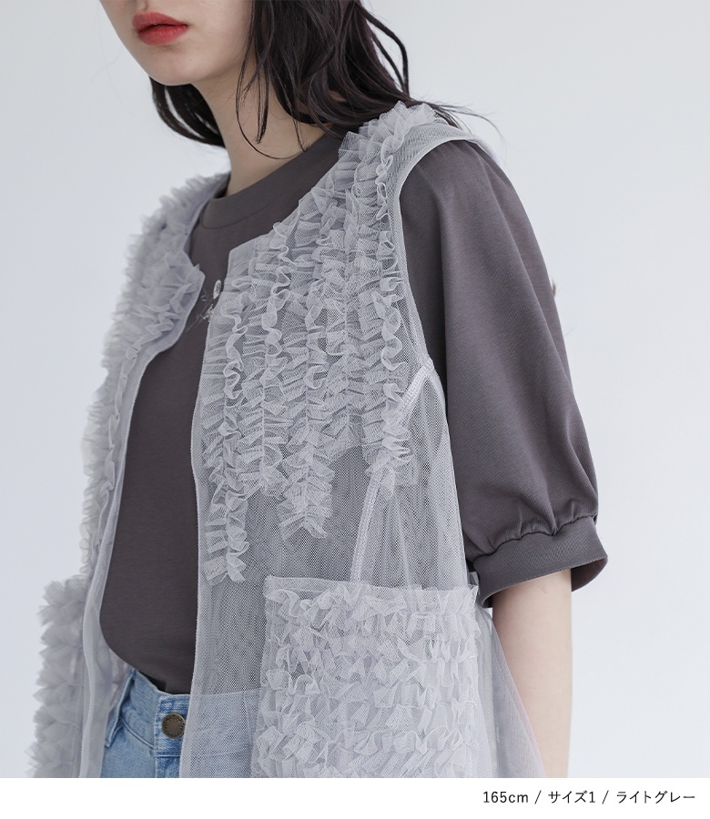 ■デザイン 贅沢に使用されたフリルが、さらっと羽織るだけで華やかな印象をプラスするチュールベスト。便利なフリルポケットも付いており、実用性も兼ね備えています。後ろヨークと襟ぐりの切り替えにはチュールをあしらい、後ろから見てもお洒落な印象に。すっきりとした切り替え線で、全体的にバランスよく見せてくれる一枚です。 ■コーディネート シンプルなTシャツやカットソーの上からさらりと羽織り、デニムやチノパンと合わせれば、ワンランク上のカジュアルスタイルに。シンプルなワンピースにプラスしてフェミニンな印象を引き立てるのもおすすめです。 ■素材 透け感のある、やわらかなチュール生地を使用。レイヤードとして、幅広いシーズンでの着回しが可能です。 |