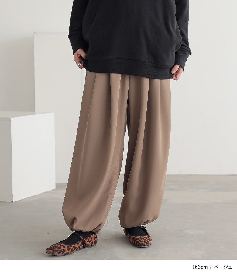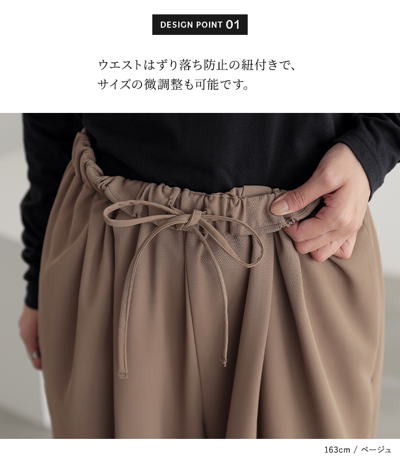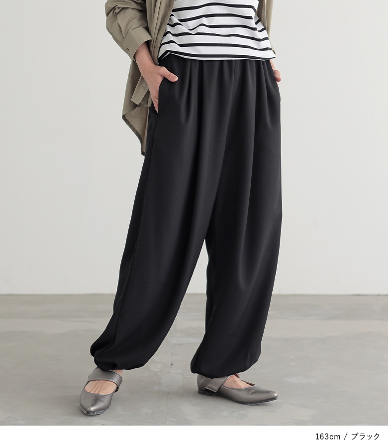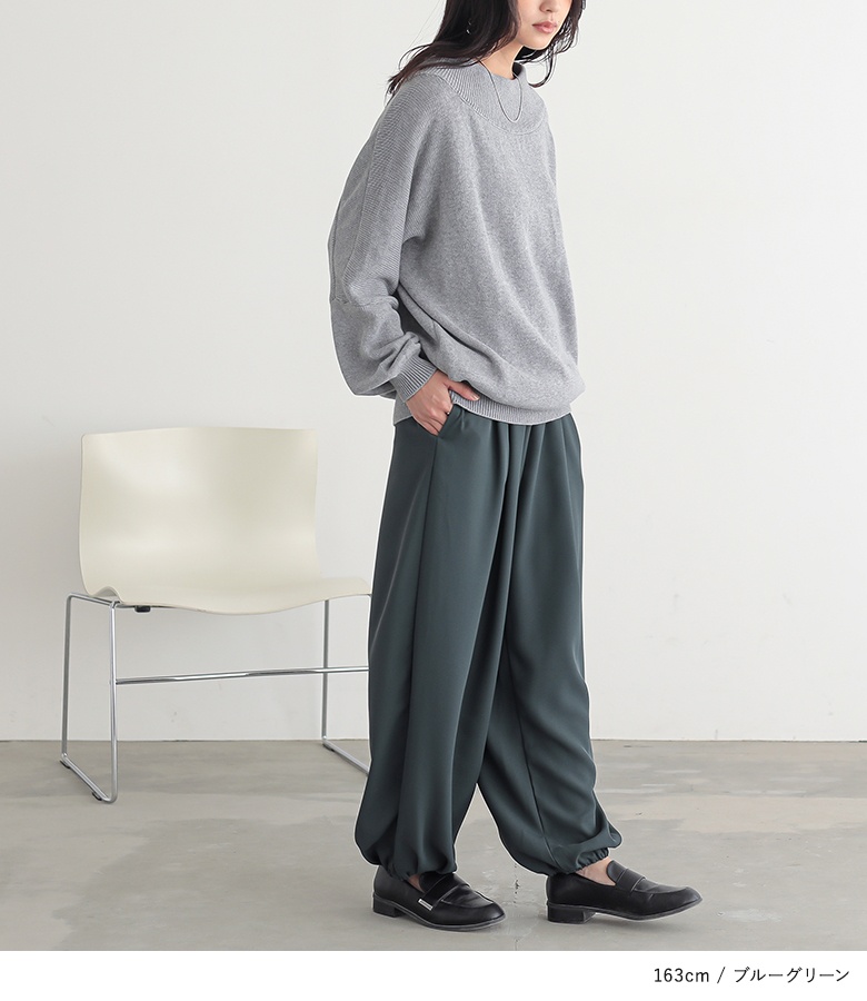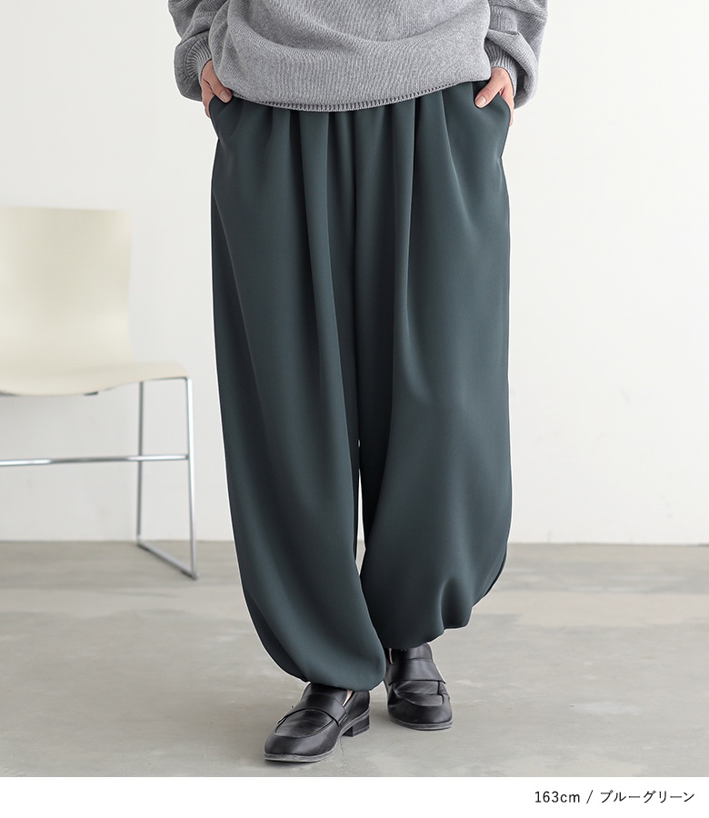 | staff:P/161cm B98 W82 H99 【普段着用】 Tops: LL Bottoms:LL | 【フリーサイズ】 着丈(ウエスト穿き):かかと上3cm位 ウエスト:ゆったり ヒップ:ゆったり 太もも周り:ゆったり 全体:ゆったり とろみ感のある落ち感素材だから、ボリュームが出すぎずすっきり見えするのが嬉しい。リラックスした穿き心地です。 |