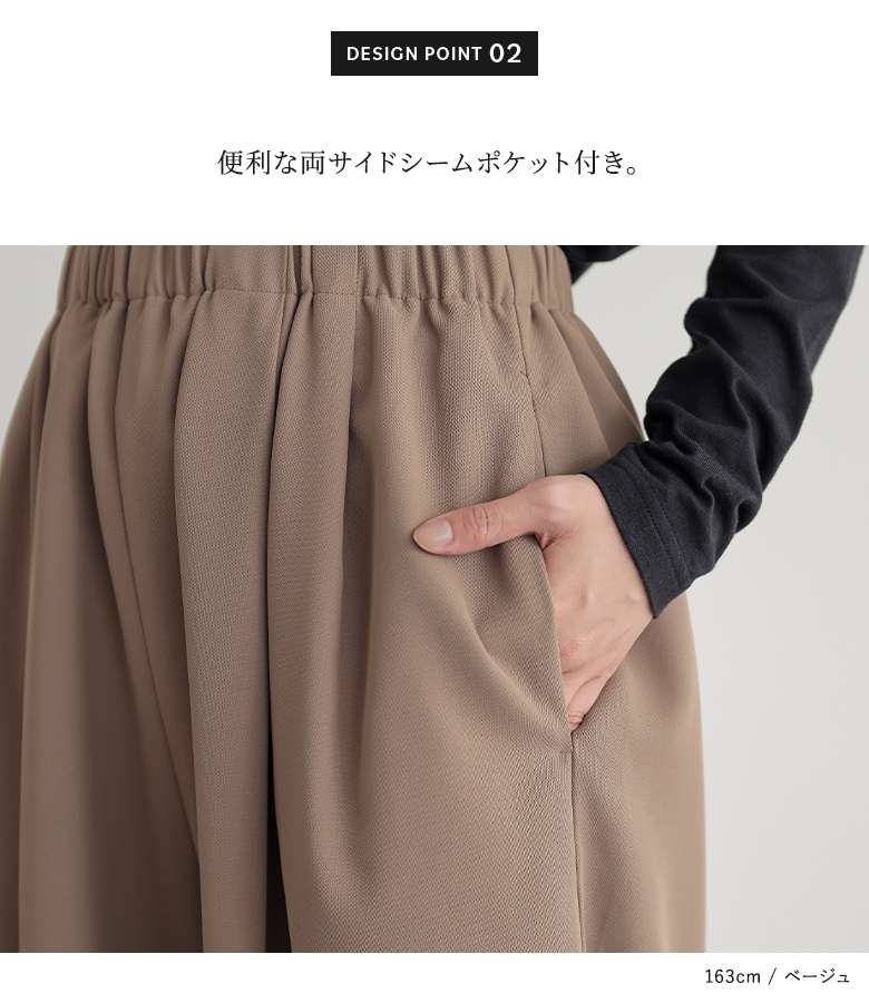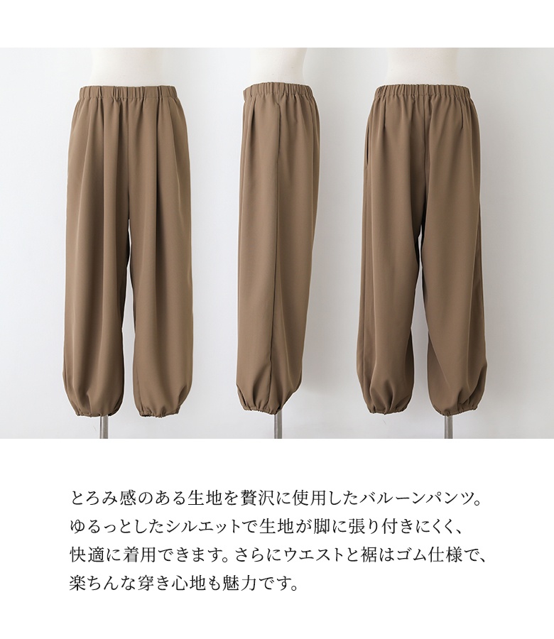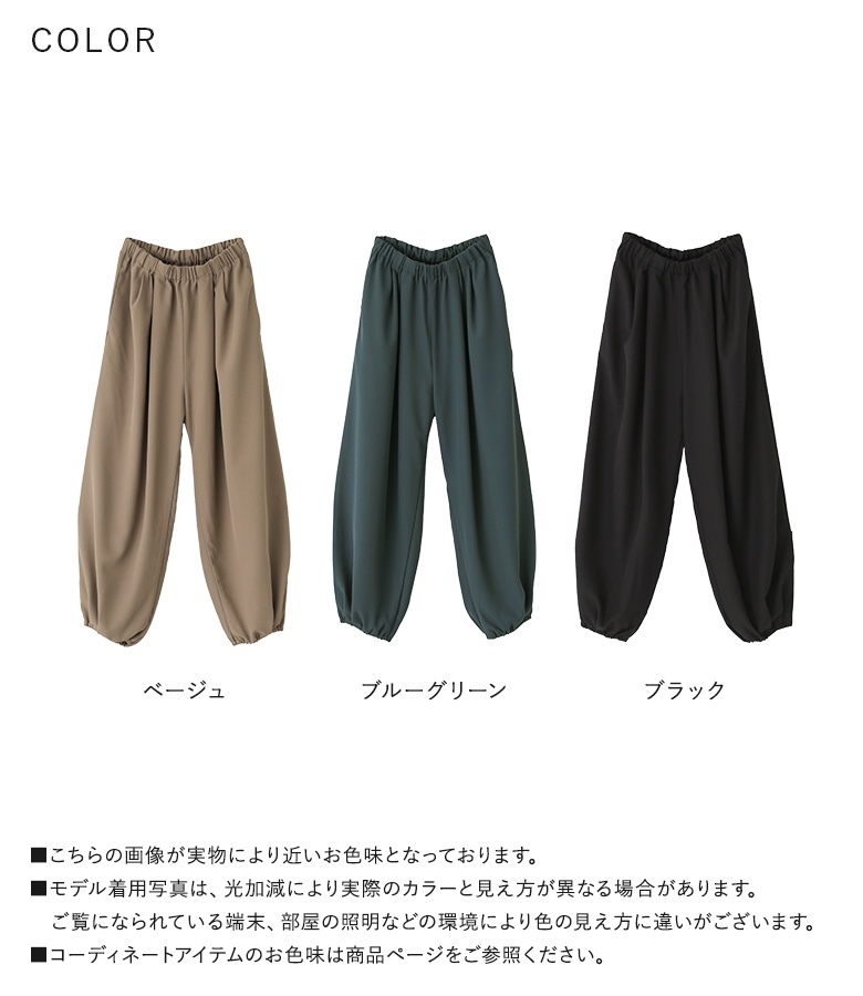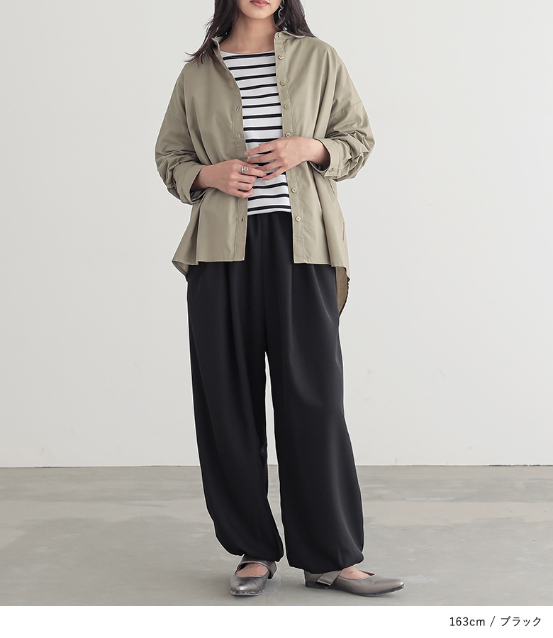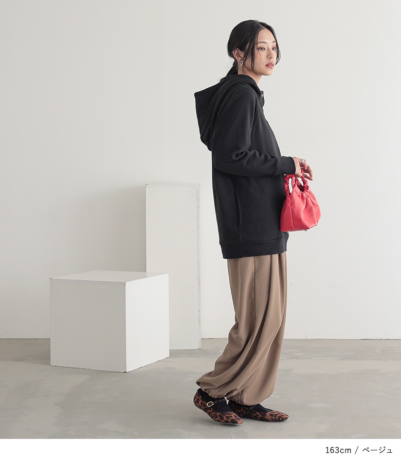| staff:P/161cm B98 W82 H99 【普段着用】 Tops: LL Bottoms:LL | 【フリーサイズ】 着丈(ウエスト穿き):かかと上3cm位 ウエスト:ゆったり ヒップ:ゆったり 太もも周り:ゆったり 全体:ゆったり とろみ感のある落ち感素材だから、ボリュームが出すぎずすっきり見えするのが嬉しい。リラックスした穿き心地です。 |