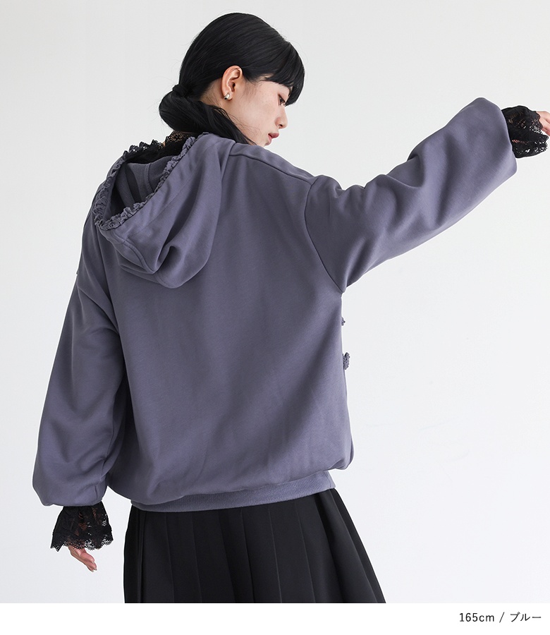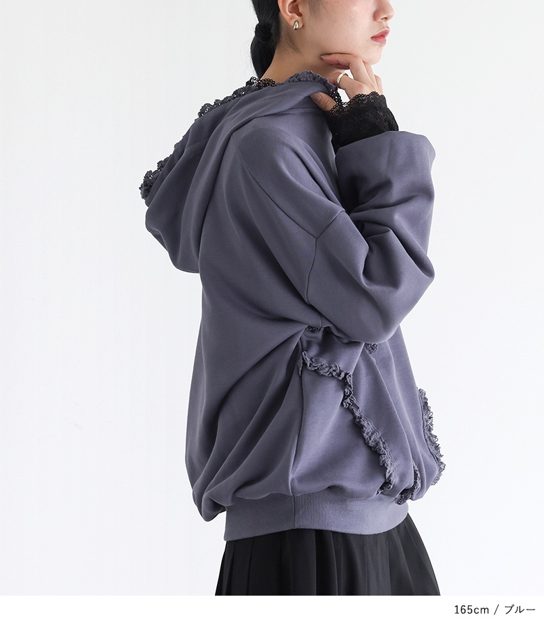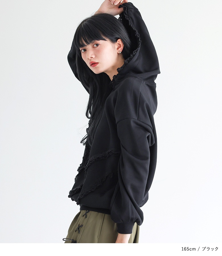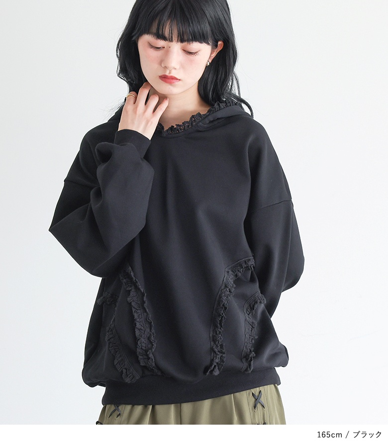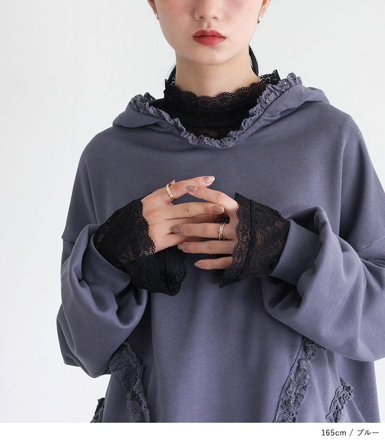 | staff:T/159cm B77 W58 H91 【普段着用】 Tops:S/M Bottoms: M/L | 【フリーサイズ】 袖丈:手の甲真ん中位 着丈:ヒップ真ん中位 腕周り:ゆったり バスト:ゆったり 全体:ゆったり フードのデザインがさりげないレースで可愛いです。 |