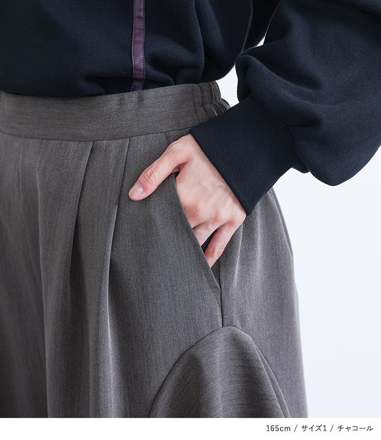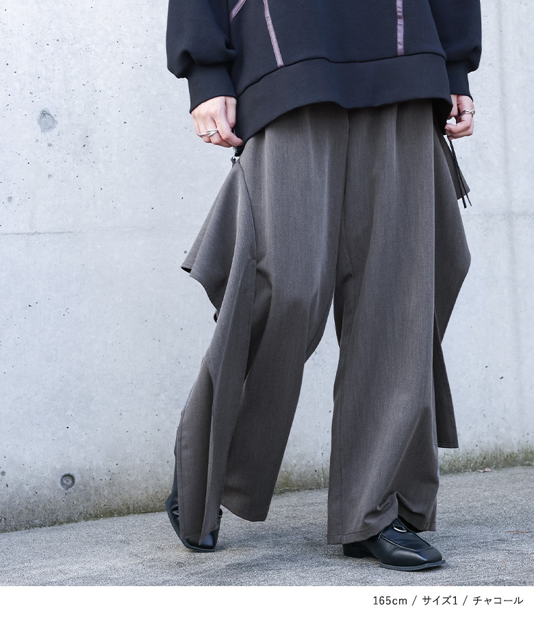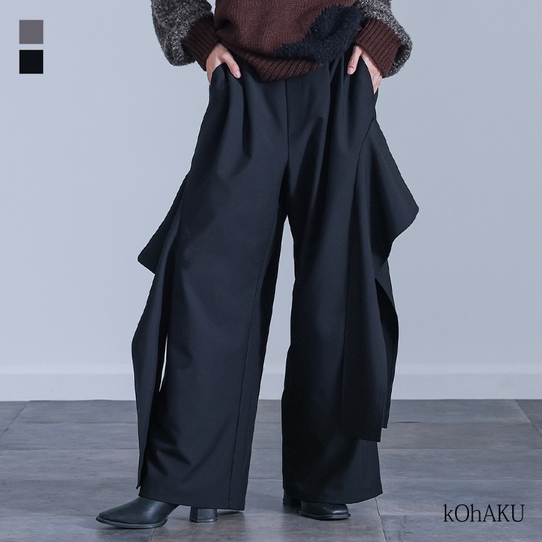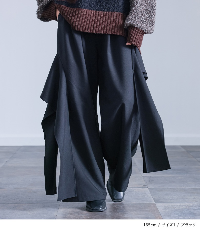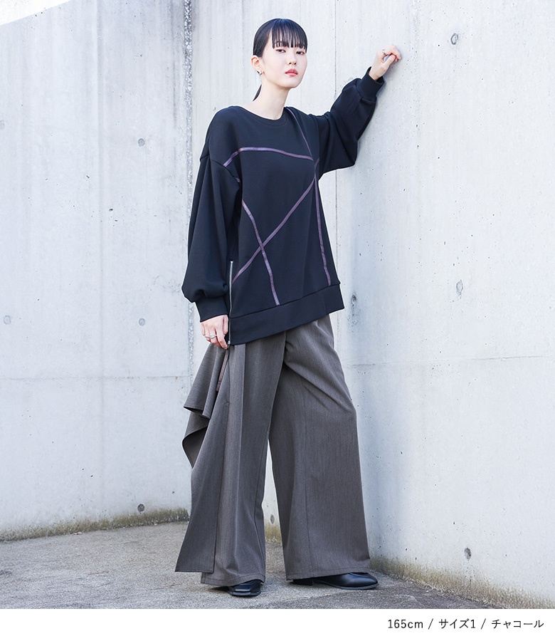 ■デザイン アシンメトリーなフレアモチーフを両サイドにデザインした、個性的なワイドパンツです。左右非対称に配置されたフレアのモチーフが、シンプルなパンツスタイルに華やかなアクセントを加えています。このフレアは、途中から縫い付けられていないフラシ仕様になっているので、歩くたびにモチーフがひらひらと揺れ、躍動感のある動きが生まれます。 ■コーディネート デザイン性の高いパンツなので、トップスはシンプルなカットソーやニットと合わせるだけで、おしゃれな着こなしが完成します。 ■素材 程よい厚みで落ち感のある素材を使用しています。ドレープ性のある生地なので、ワイドシルエットでも広がりすぎず、上品な印象で着用いただけます。 |