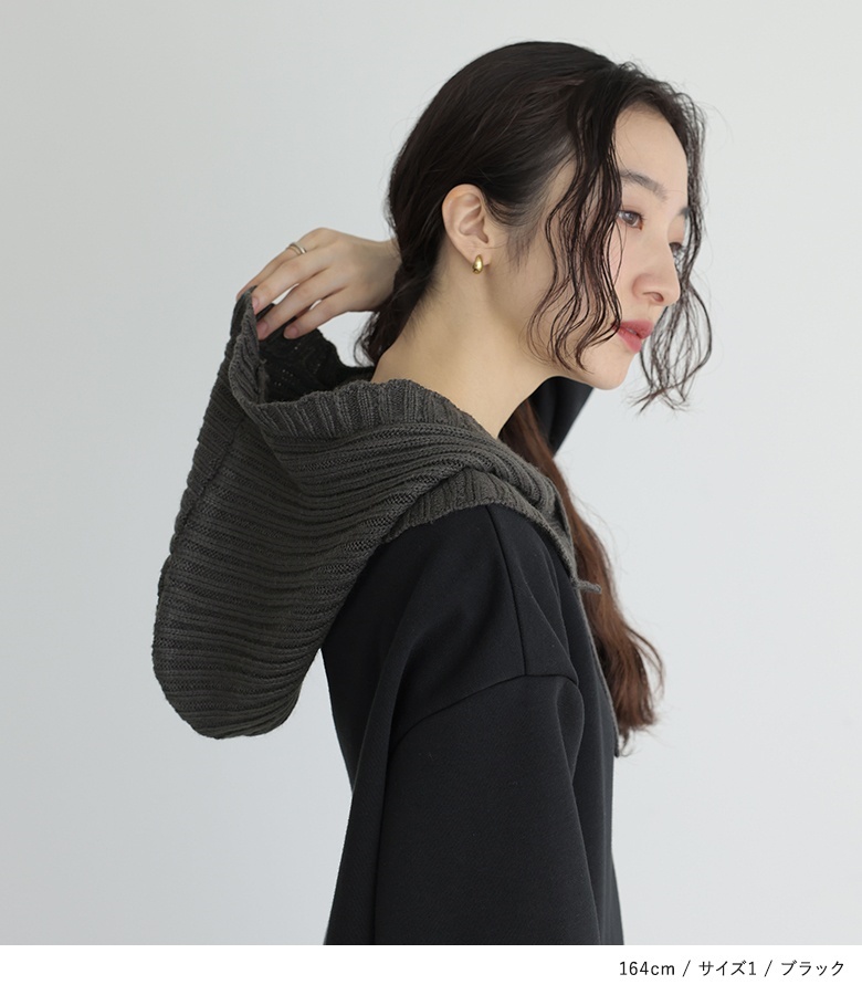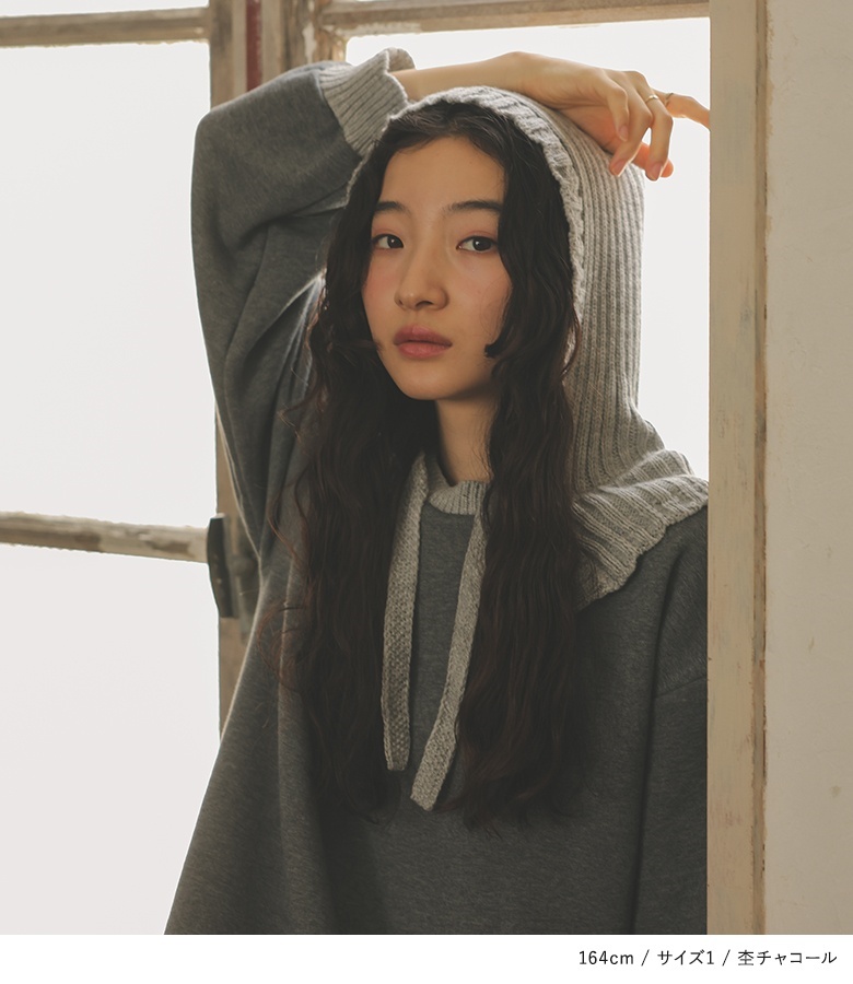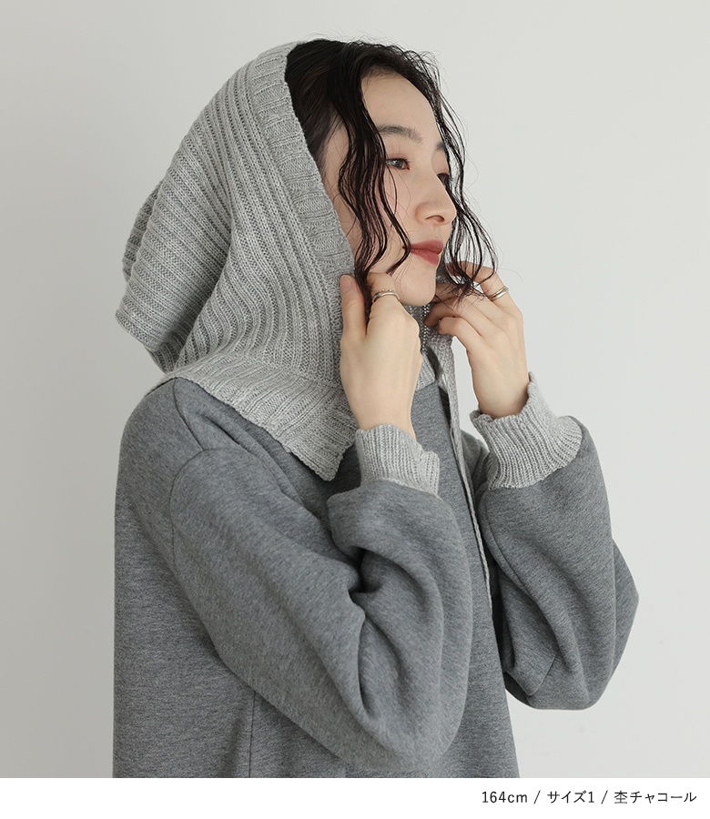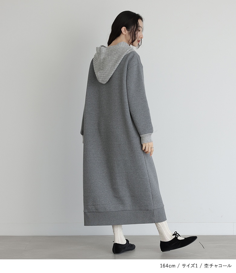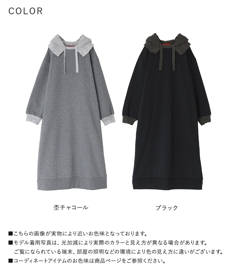 ■デザイン フードと袖口はニットで編み立てた、まるでバラクラバをドッキングさせたようなワンピース。裏起毛生地を使用した、暖かな着心地のアイテムです。Iラインシルエットですっきりとご着用いただけます。 ■コーディネート 一枚でコーディネートが決まる嬉しいアイテム。着こなしが単調になりやすいワンピースは、足元やアクセサリーなど小物で遊ぶと◎ ■素材 本体部分には柔らかな肌触りのスウェット生地を使用。裏起毛で暖かな着心地を叶えます。フードと袖口にはリブ編みのニットをドッキングさせました。 |