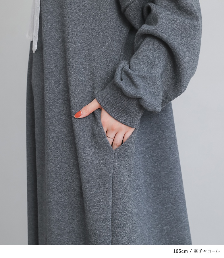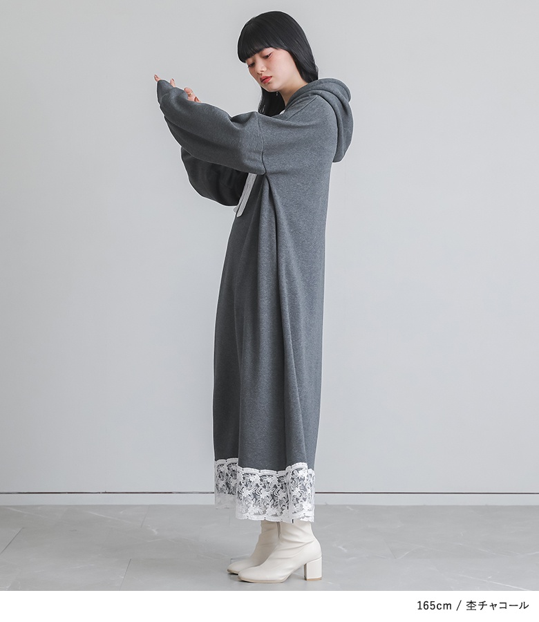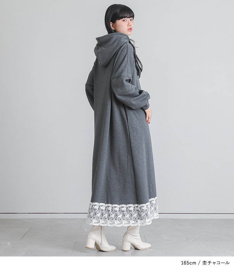 ■デザイン あたたかい裏シャギー生地を使用したワンピース。フードの紐、裾にレースを贅沢にあしらった印象的なデザインに仕立てました。カジュアルな印象のパーカーワンピースにレースをプラスし周りと差のつく雰囲気のあるお洒落が完成。 ■コーディネート 一枚でコーディネートが完成する主役級ワンピースカジュアルさと甘さの両方を兼ね備えたデザインで、足元もキレイめのブーツやパンプスからカジュアルなスニーカーまで、幅広く合わせていただけます。 ■素材 身生地には暖かな裏シャギーカットソー生地を使用。フードの紐のレースには繊細な柄のチュールレーステープ、裾のレースにはスカラップデザインのレーステープを使用しました。暖かく柔らかな着心地で寒い季節も快適にご着用いただけます。 |