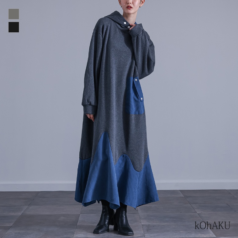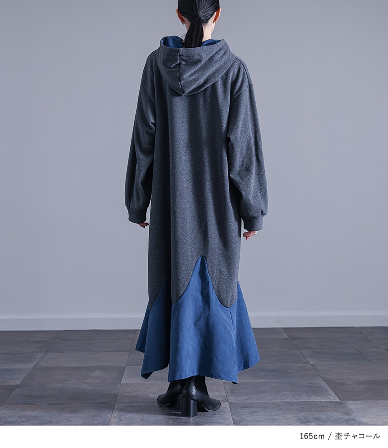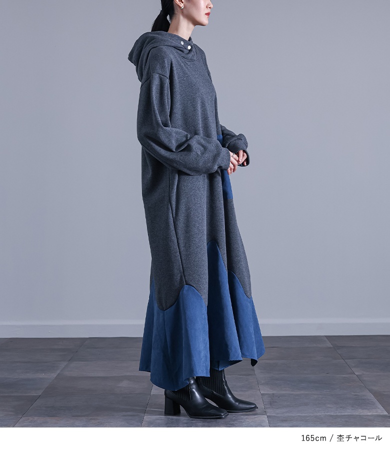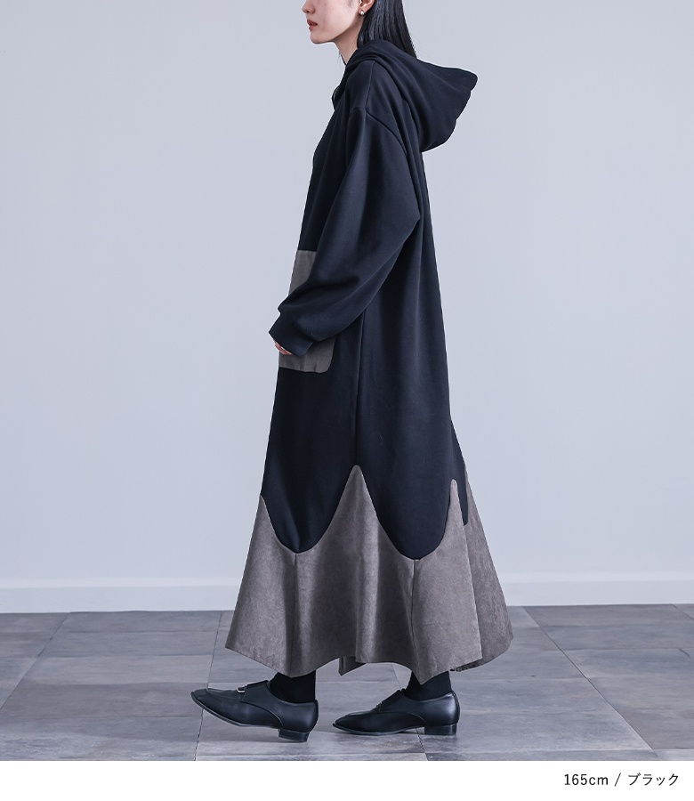 ■デザイン 裾をランダムのカーブで切り替えた、異素材使いがお洒落なフード付きワンピース。裏シャギー生地で暖かく、快適な着心地です。フードにはドットボタンがついているので、着こなしに合わせて開閉することができます。飾りフラップが付いた異素材のパッチポケットもポイントに。 ■コーディネート 個性的なデザインのワンピースなので、一枚着るだけでモードな世界観を楽しめるお洒落なアイテムです。タートルネックのインナーと合わせて、首元からちらりと覗かせても。 ■素材 身頃は暖かな裏シャギー生地。異素材部分にはやや起毛感のあるマットな質感のピーチ素材を使用し、上品な印象に仕上げました。 |