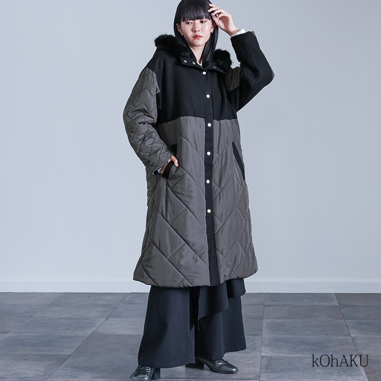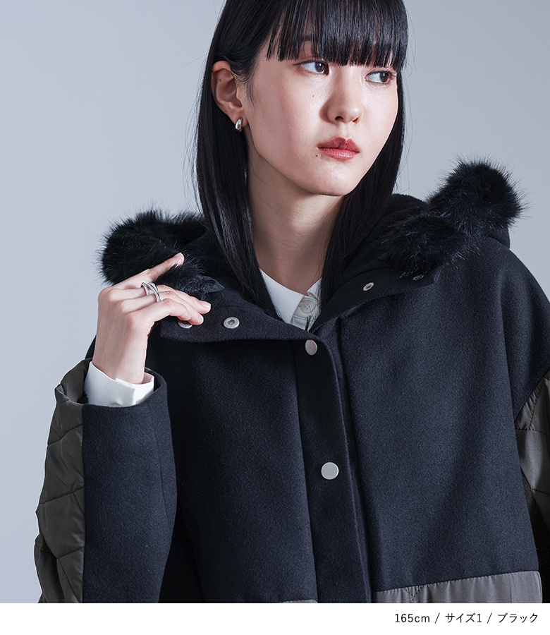■デザイン フードには取り外し可能なフェイクファーをあしらいました。前立てと後ろスリット部分にはシルバーのドットボタンを配し、さりげないアクセントをプラスしています。 ■コーディネート 無地のアイテムはもちろん、柄ものとも合わせやすく、洗練されたモードスタイルが完成します。羽織るだけでコーディネート全体を格上げしてくれる一着です。 ■素材 身頃にはメルトン生地を使用し、袖と裾部分は中綿入りのキルティング仕様。裏地は全面に柔らかく肌触りの良いボア生地を採用しています。 |