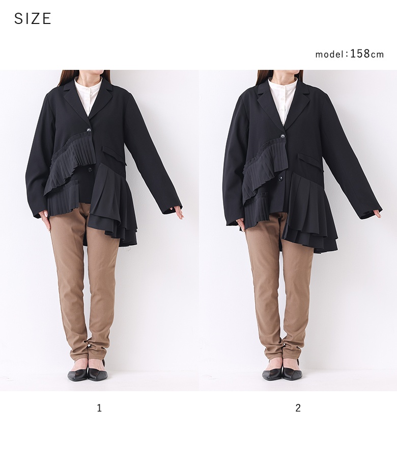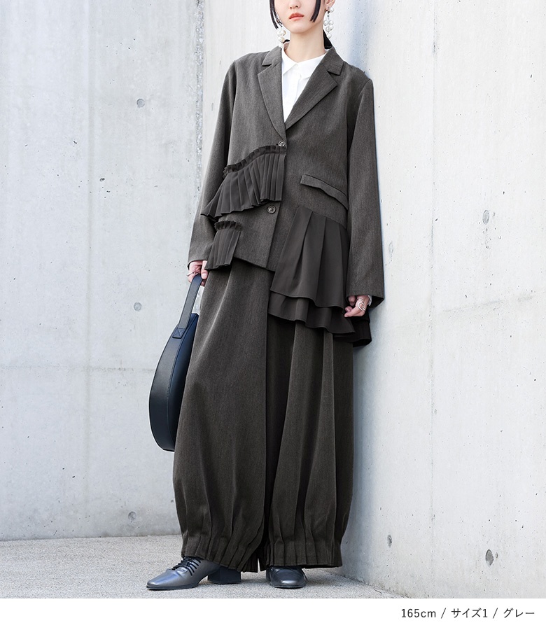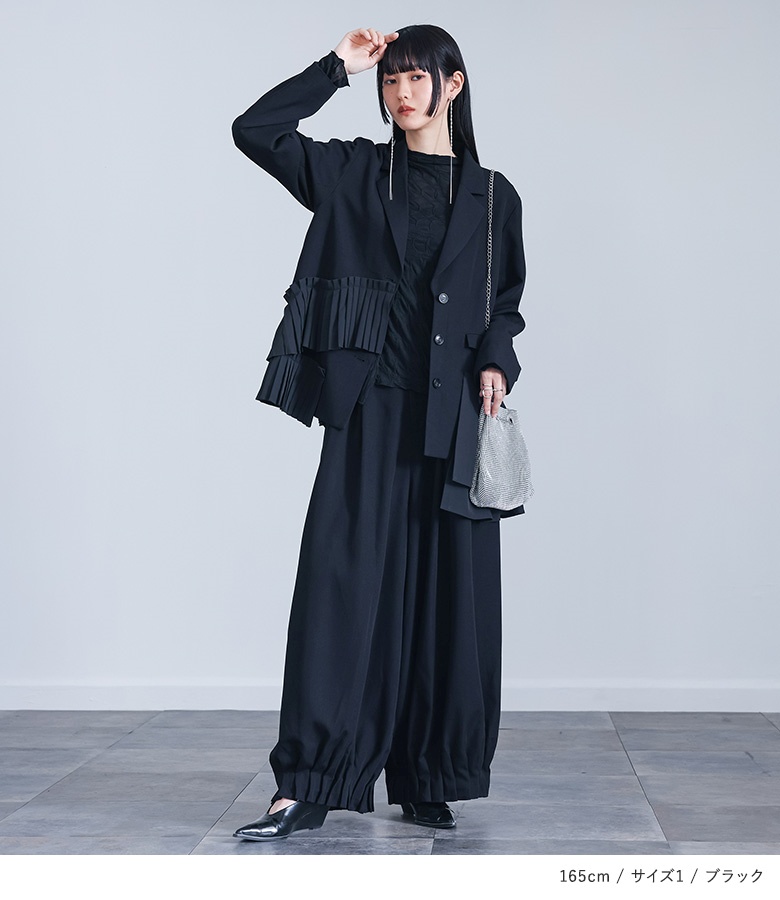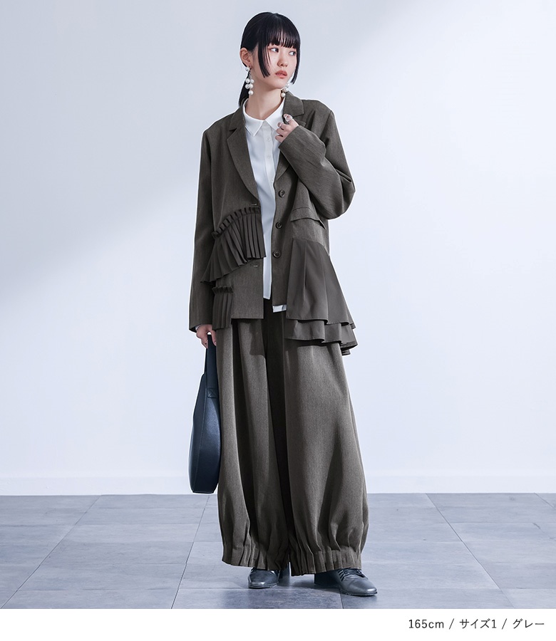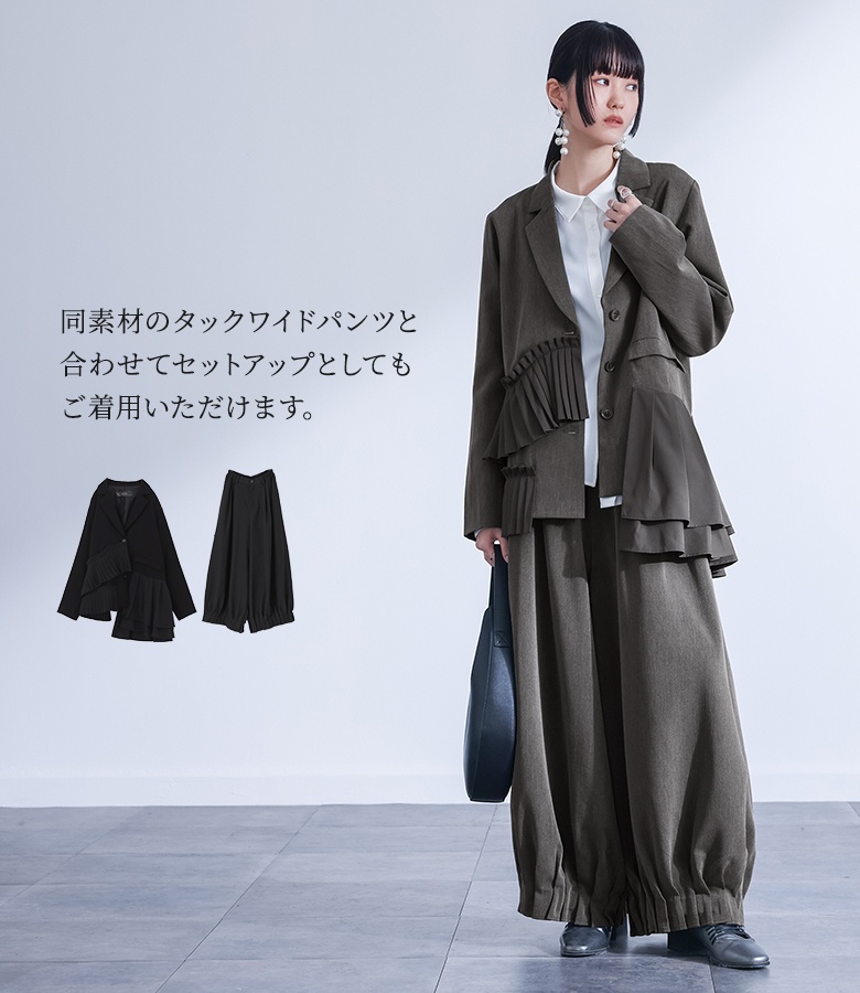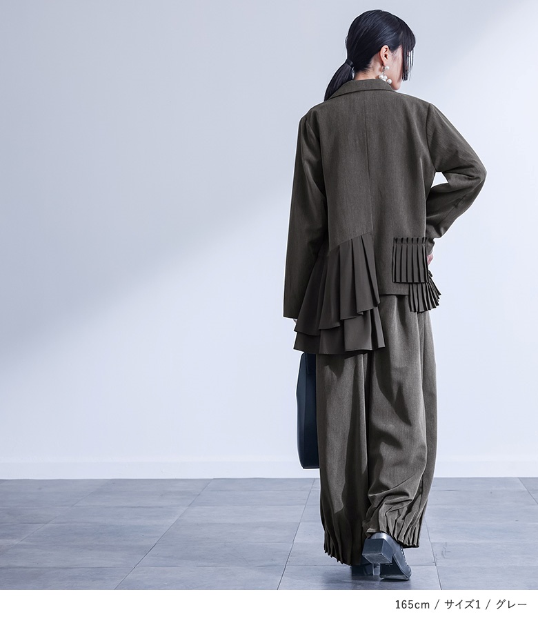 ■デザイン 異素材のフリルとプリーツパーツを大胆に組み合わせた、アシンメトリーデザインの個性あふれるジャケット。右側には、ひだ飾りのような加工を施した生地をカーブ状に縫い付け、その下には垂直な生地をドッキング。左側には、広がりを持たせた生地のパーツを二段重ねてあしらい、見る角度によって印象を変える遊び心のある仕上がりに。通常のジャケットでは物足りない、特別な日にもふさわしいテーラードジャケットです。 ■コーディネート ドレスやブラウスの上に羽織るだけで、華やかでモードな装いに。ボトムスはシンプルなテーパードパンツやスカートを選ぶと、ジャケットのデザインがより際立ちます。同素材のタックワイドパンツと合わせてセットアップとしてもご着用いただけます。 ■製品についての注意書き この製品はプリーツ加工を施していますが永久的なものではなく、着用や水洗い、クリーニングを繰り返す事によりプリーツが消失する恐れがあります。 洗濯はネットを使用し、脱水は短時間で処理し直ちに干してください。 ご了承の上、ご購入いただきますようお願いいたします。 |