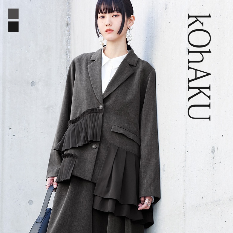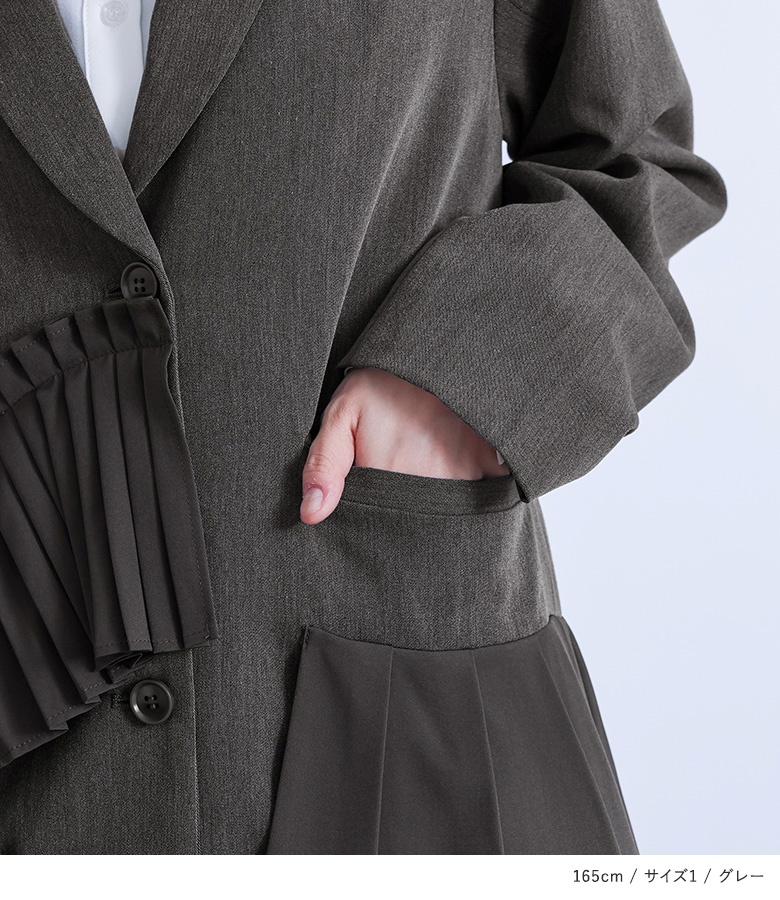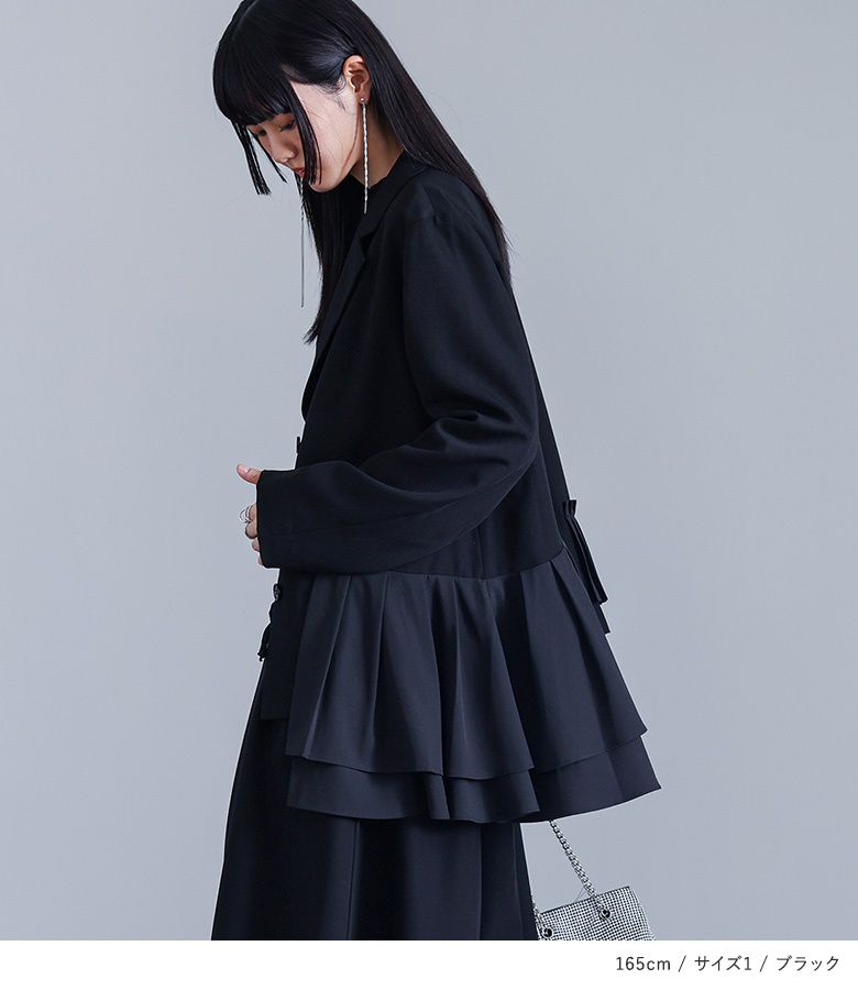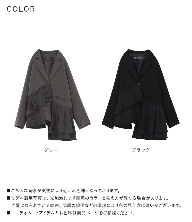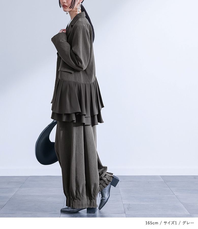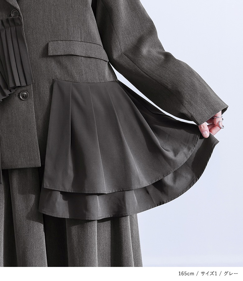 ■デザイン 異素材のフリルとプリーツパーツを大胆に組み合わせた、アシンメトリーデザインの個性あふれるジャケット。右側には、ひだ飾りのような加工を施した生地をカーブ状に縫い付け、その下には垂直な生地をドッキング。左側には、広がりを持たせた生地のパーツを二段重ねてあしらい、見る角度によって印象を変える遊び心のある仕上がりに。通常のジャケットでは物足りない、特別な日にもふさわしいテーラードジャケットです。 ■コーディネート ドレスやブラウスの上に羽織るだけで、華やかでモードな装いに。ボトムスはシンプルなテーパードパンツやスカートを選ぶと、ジャケットのデザインがより際立ちます。同素材のタックワイドパンツと合わせてセットアップとしてもご着用いただけます。 ■製品についての注意書き この製品はプリーツ加工を施していますが永久的なものではなく、着用や水洗い、クリーニングを繰り返す事によりプリーツが消失する恐れがあります。 洗濯はネットを使用し、脱水は短時間で処理し直ちに干してください。 ご了承の上、ご購入いただきますようお願いいたします。 |