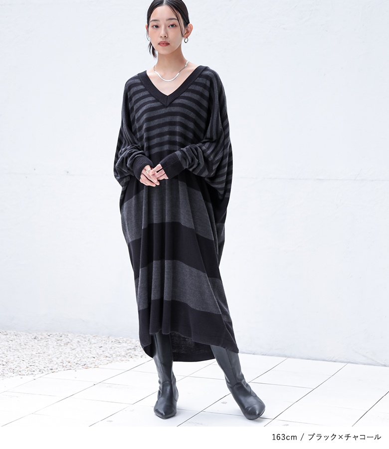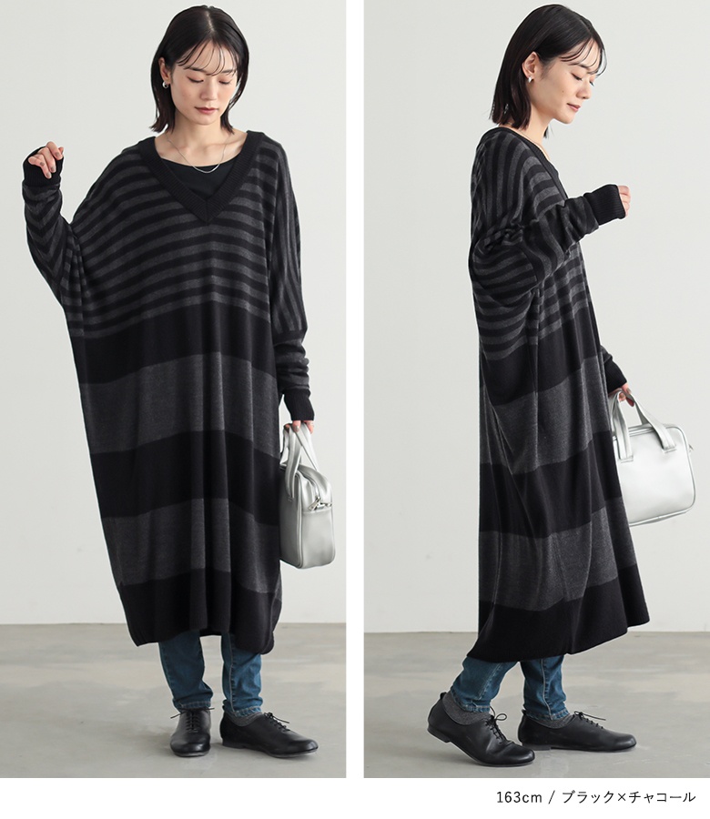 | 「標準さん」 157cm/51kg B85 W69 H89 普段はM またはLサイズ着用。 | 膝下10cmくらいの着丈になりました。手は指先まですっぽりと隠れるくらいの長さです。ゆとりのあるデザインですが、きれいなシルエットで着る事ができました。 |